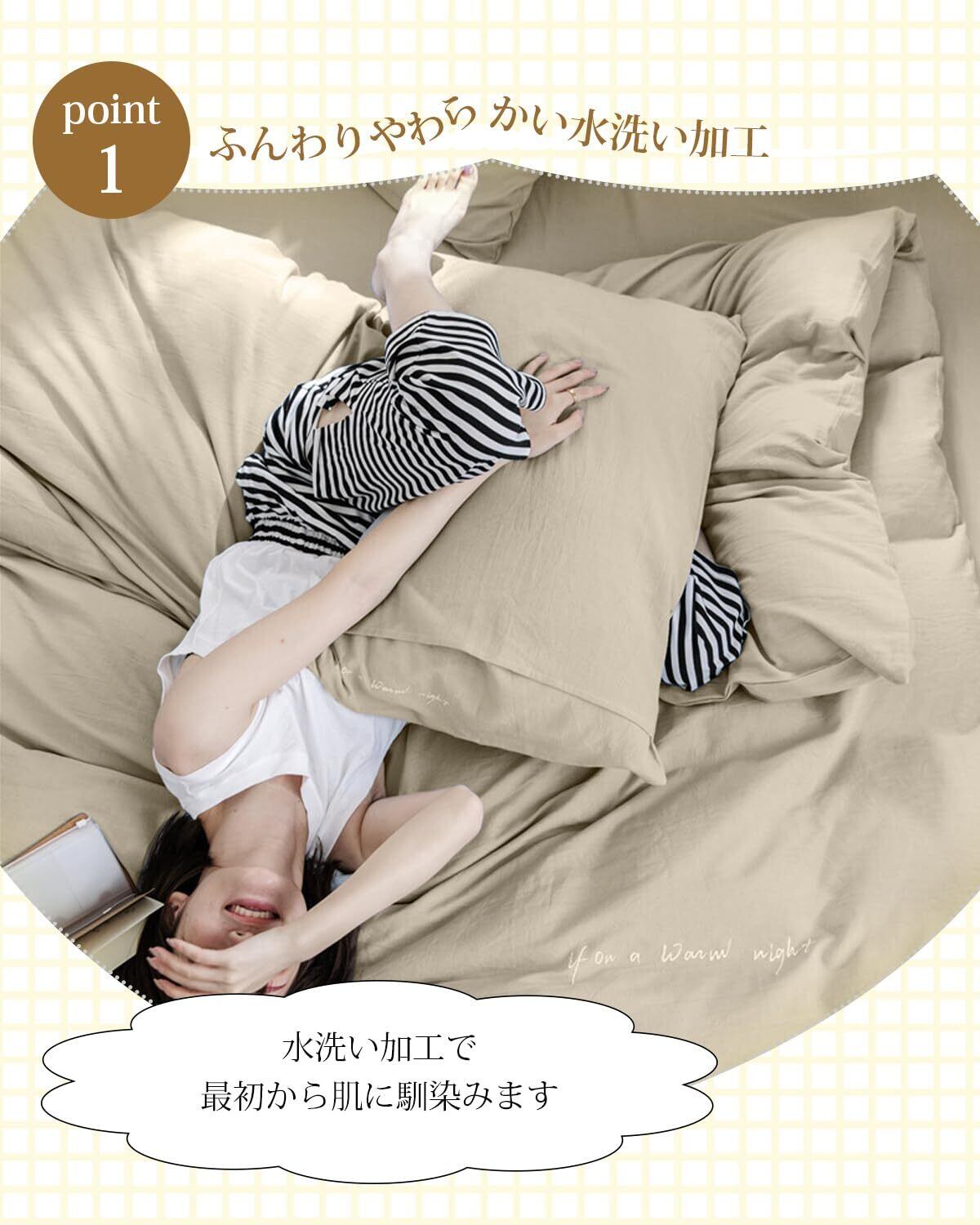 高密度生地·オールシーズン快適」高密度織りの生地を厳選して、丁寜な縫製で長期間の使用にも耐える顽丈な仕上がりです。通気性が良くて、吸湿性と保温性に優れていることから、年間を通して快適な生地です。洗いさらし加エによって、生地の良い特性を保ちながら、縮みやすいデメリットも改善できるようになります。