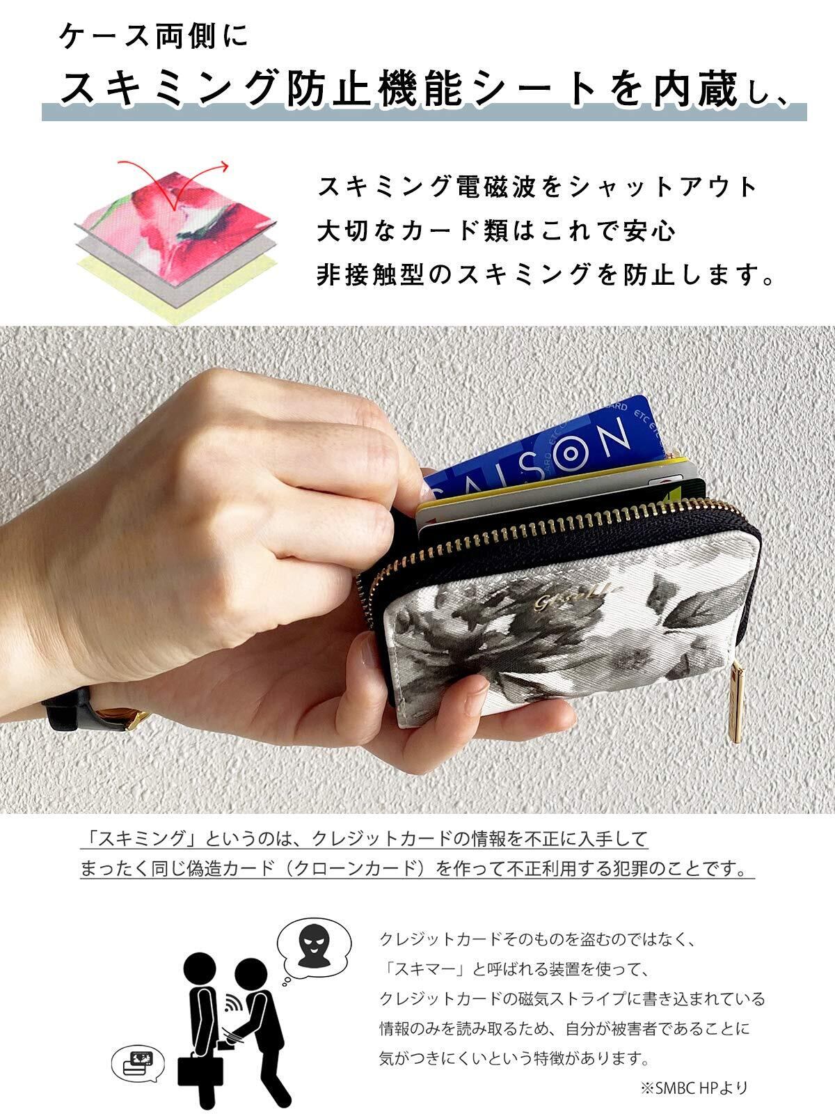 【 スキミング 防止 大切 な カード を 守る 】 カードケース の 両側 に RFID スキミング 防止 素材 を 採用 。 近年増加している スキミング被害 から 大切 な カード を 守ります。 ※ ICカード も 収納可能 ! ICカード は ファスナー を 開けて カード を 少し 出していただくと 改札機 に 反応 します。