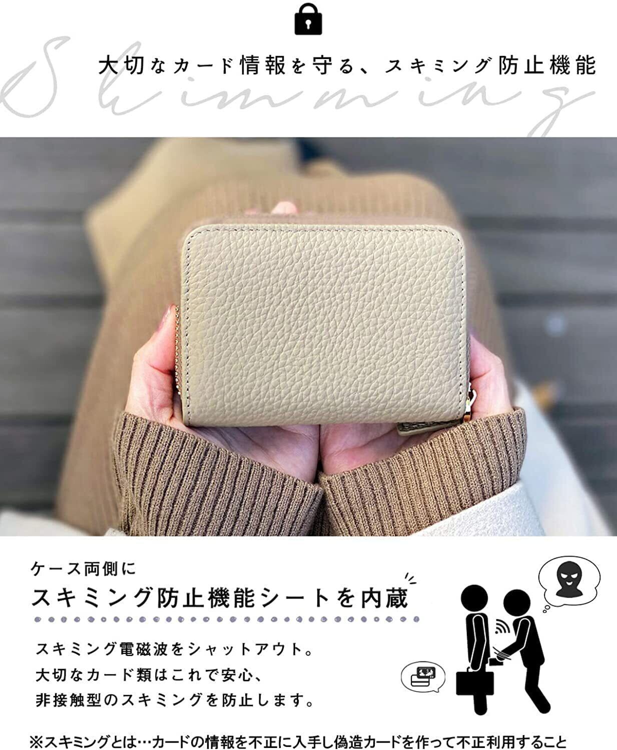 【スキミング防止 大切な情報を守るクレジットカードケース】 ミニ財布両側にスキミング防止機能シートを内蔵。 スキミング電磁波をシャットアウト。 大切なカード類はこれで安心、非接触型のスキミングを防止します。