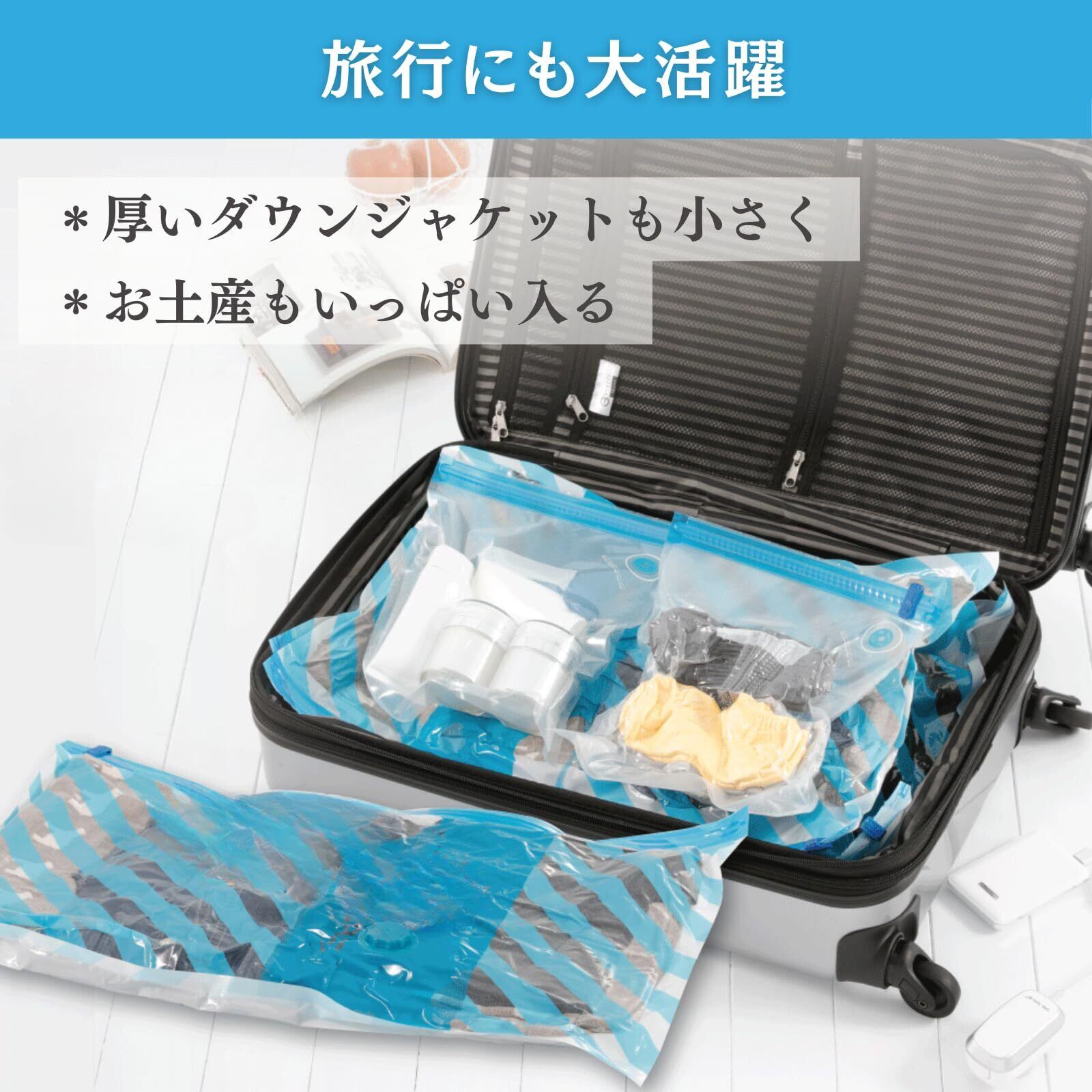 【利便性の高い5サイズ展開】飛行機手荷物サイズに便利なS(30×50cmサイズ)をはじめ、シングルかけ布団が入るXXLサイズまでをご用意。