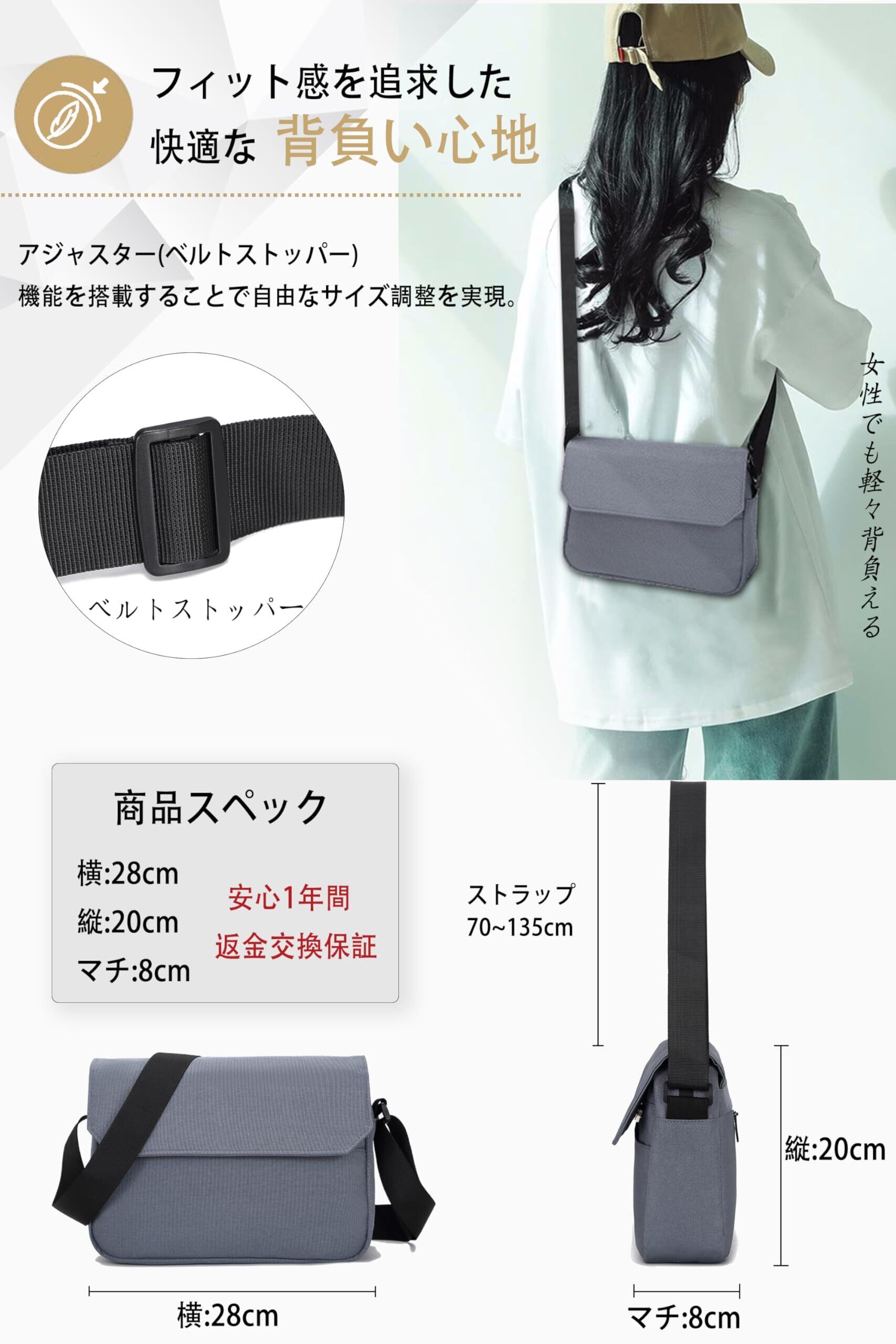 【多機能収納】サイズ(長さ*幅*高さ):28*8*20cm。500mlペットボトル、10.5インチipad、折り畳み傘が入る横長サイズ。ちょっとしたお出かけに、最低限のモノをコンパクトに持ち運べる容量に。整理整頓がしやすい3層8ポケット収納。鍵の取付に便利なキーストラップを装備。さらに、防犯用の隠し背面ポケット付き。毎日持ち歩くショルダーバッグとして優秀です!
