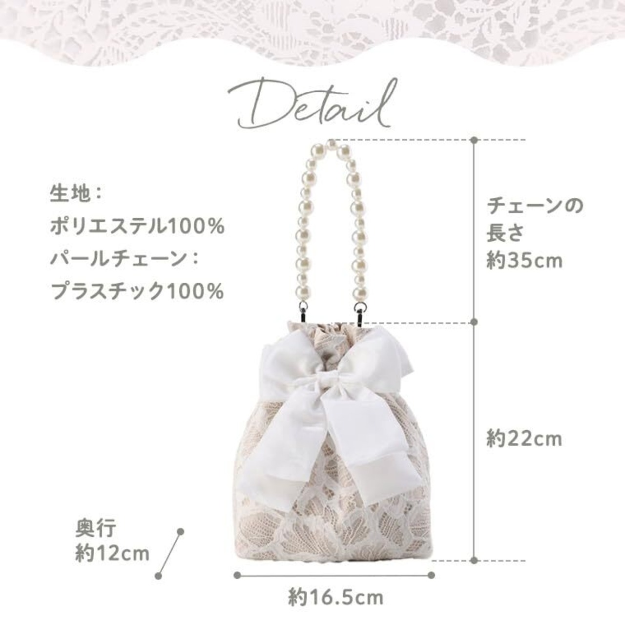 レース 巾着 パールチェーン 付き 大容量