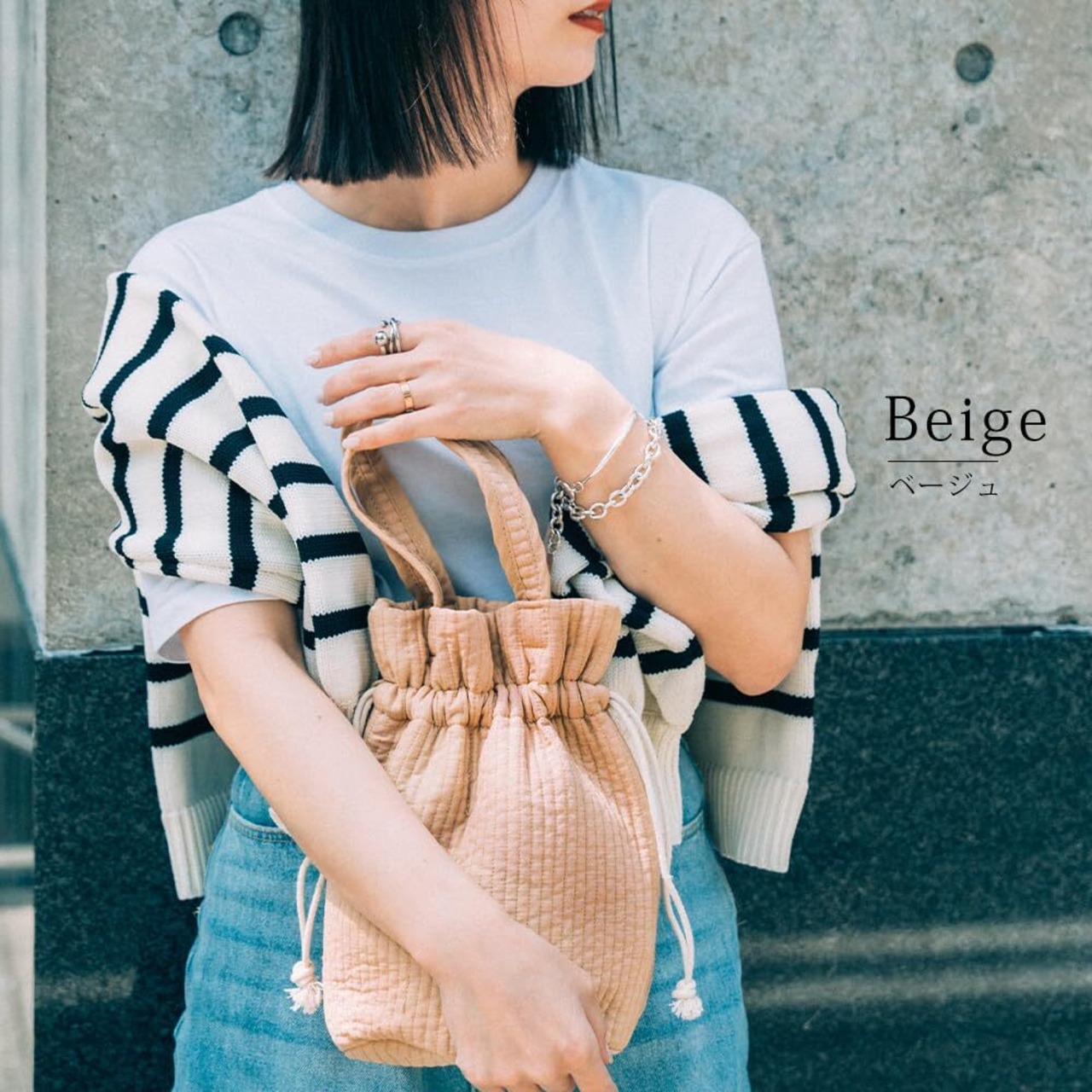 財布、ポーチ、手帳、スマホ、ハンドタオル等お出かけに必要な物がしっかり入る、程よいサイズ感&見た目以上の収納。 巾着型でキュッと絞れば中身が見える心配もありません。