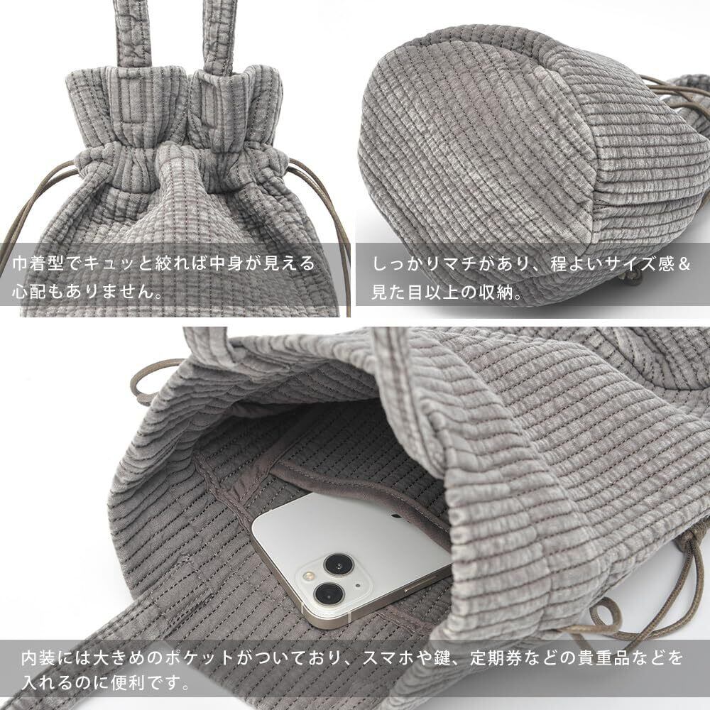 財布、ポーチ、手帳、スマホ、ハンドタオル等お出かけに必要な物がしっかり入る、程よいサイズ感&見た目以上の収納。 巾着型でキュッと絞れば中身が見える心配もありません。