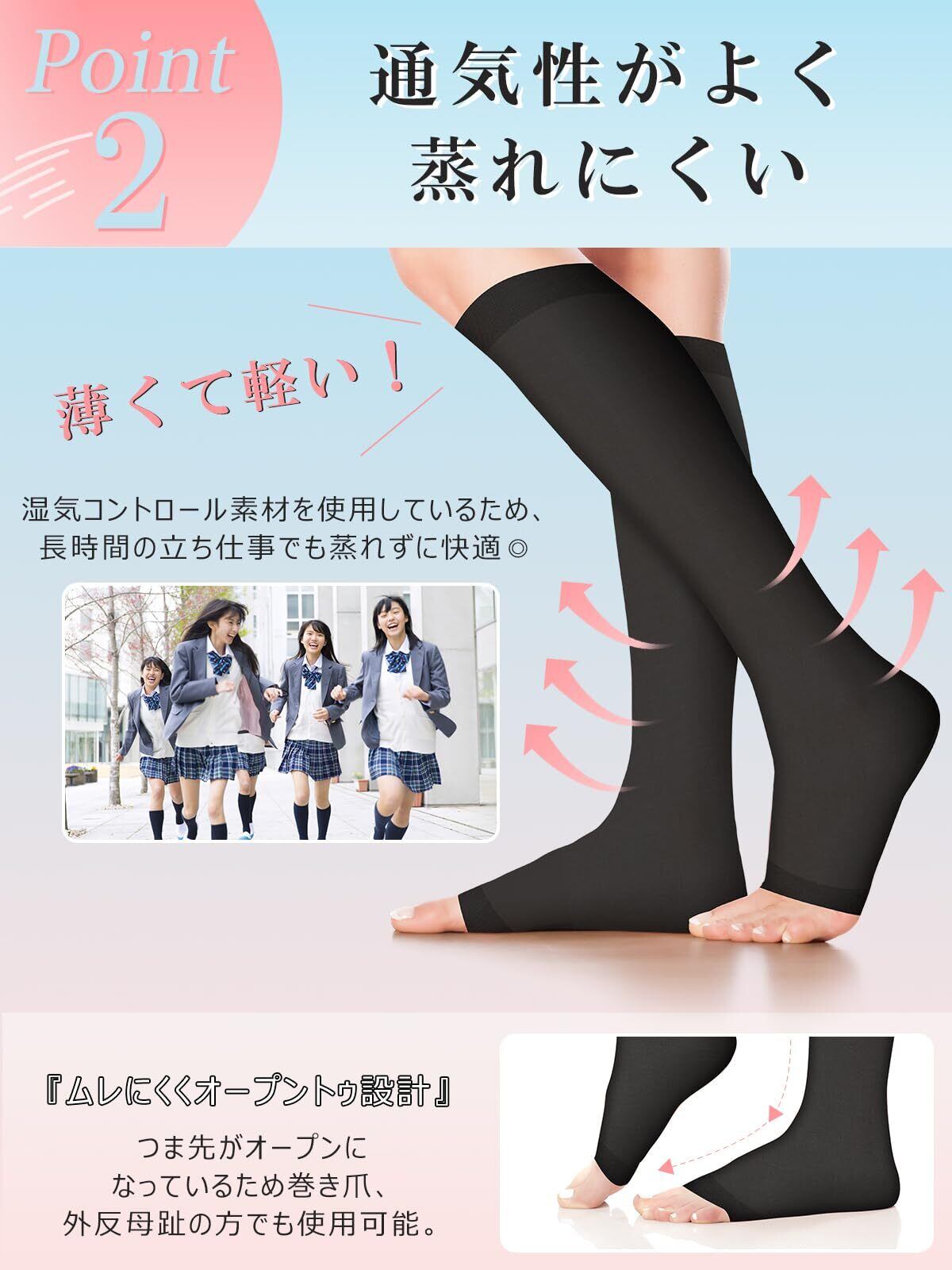 【段階圧力設計・むくみスッキリ】足首からふくらはぎにかけて段階的に圧力が異なるデザインは、血流をスムーズに保ちます。これにより、日常的なむくみを軽減し、脚の疲れを和らげます。立ちっぱなしや座りっぱなしの方に特におすすめです。