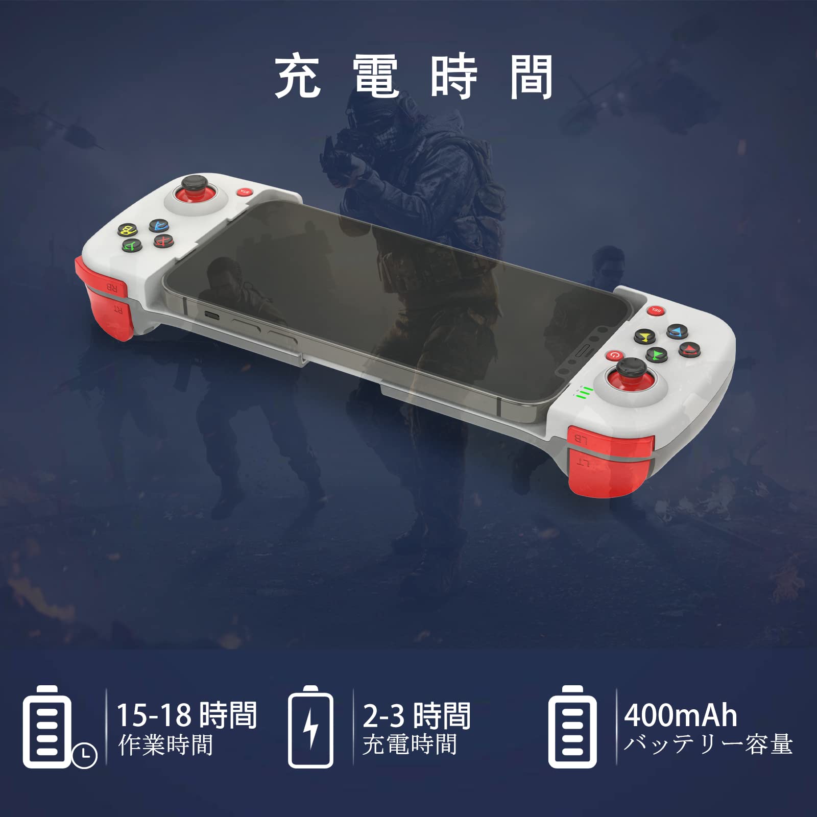 【長時間の使用が可能】スマホコントローラーはBluetooth 5.0のワイヤレス伝送で、接続距離は最大8mまで遅延なく接続できます。 フル充電で最大20時間連続使用可能な充電池を内蔵し、安全で安定した使用が可能です。