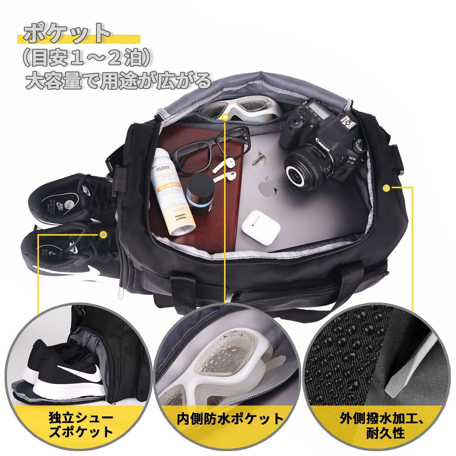 【軽量で大容量 ボストンバッグ】:サイズは45×28×24cm、容量37Lで(1泊~2泊に最適)。内側と外側に多数のポケットを配置し、衣類や化粧品、電子機器、書類などを整理して収納できます。夏服8~10枚やラップトップ、iPadなどの持ち運びにも便利です。
