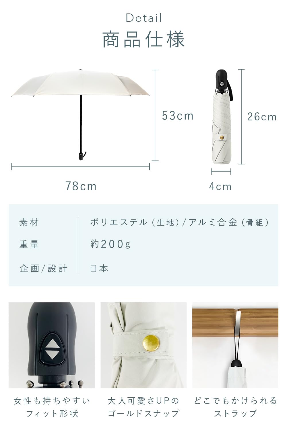 【ワンタッチ自動開閉】ボタンを押すだけで傘がパッと開いて、折りたたみもシュパっと閉じる。片手でカンタンに使える軽量仕様で、荷物を持っていてもラクラク操作。