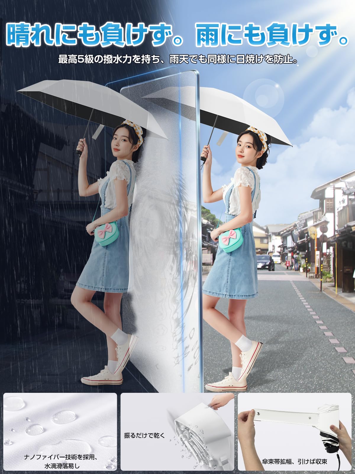 【100% 紫外線防止 & 100% 遮光・遮熱日傘】 特殊なコーティング技術と素材を使用し、100% の紫外線遮断性能を実現しています。有害な紫外線を完全に遮り、肌を日焼けや老化から守り、健康な肌を維持するために役立ちます。100% の遮光・遮熱機能も備えています。日差しの強い日にも傘を開けるだけで涼しさを感じられ、太陽の光と熱を効果的に遮断して、快適な空間を作り出します。