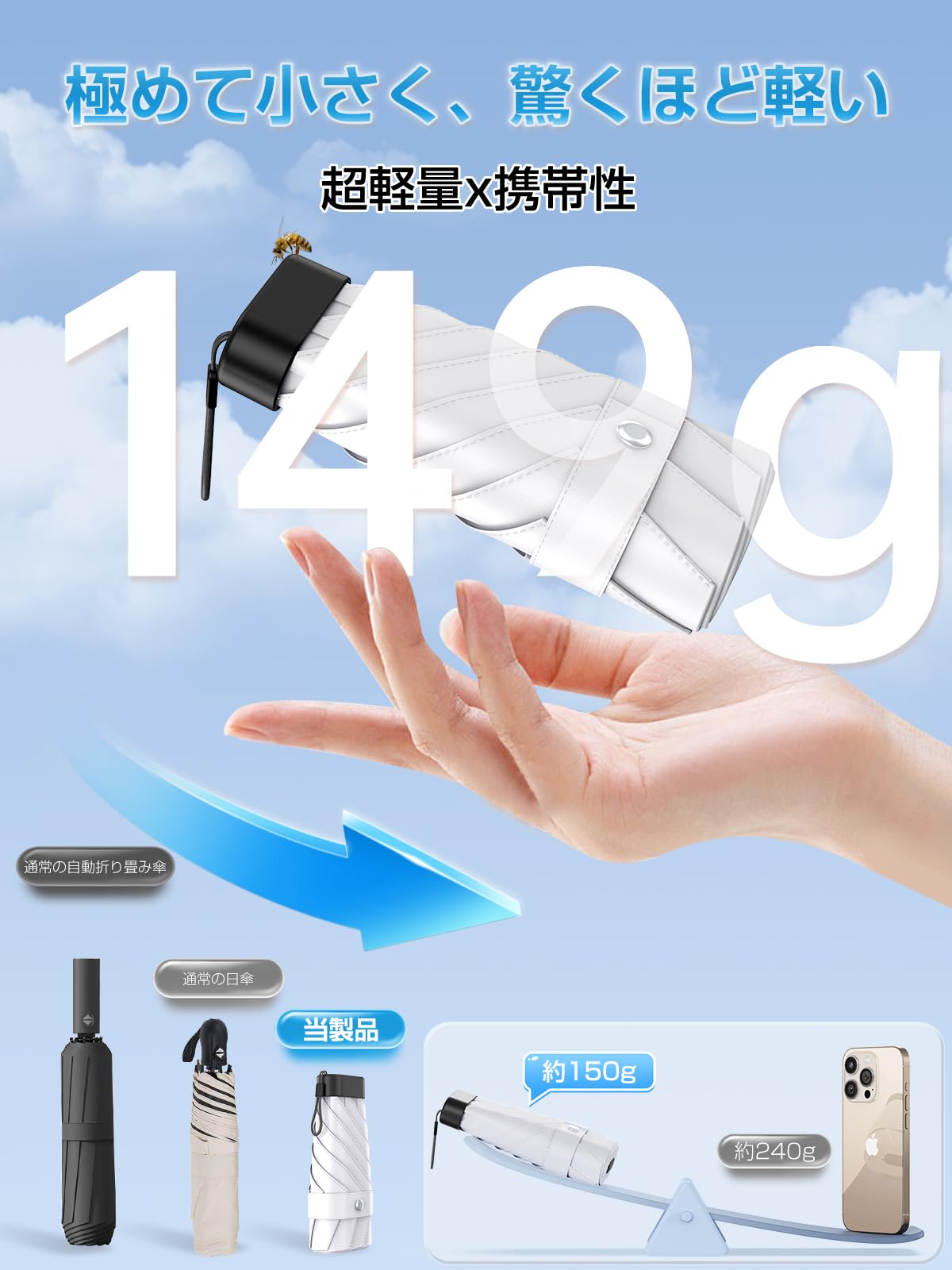 【149g 究極の軽量性 & 携帯性抜群】この軽量おりたたみ傘は、 軽量化技術を凝縮し、素材選択から構造設計まで細部にこだわり、極限まで軽く作られています。たった 149g の重量で、持ち上げるとほとんど存在感を感じないほどで、日常外出や旅行にも持ち運びが全く負担になりません。折り畳み式のデザインで、非常にコンパクトに収まります。小さなバッグやポケットにも簡単に入れられ、出先でも邪魔になりません。サイズは小さいけれど、機能は損なわれず、必要な時には素早く展開して使用できます。