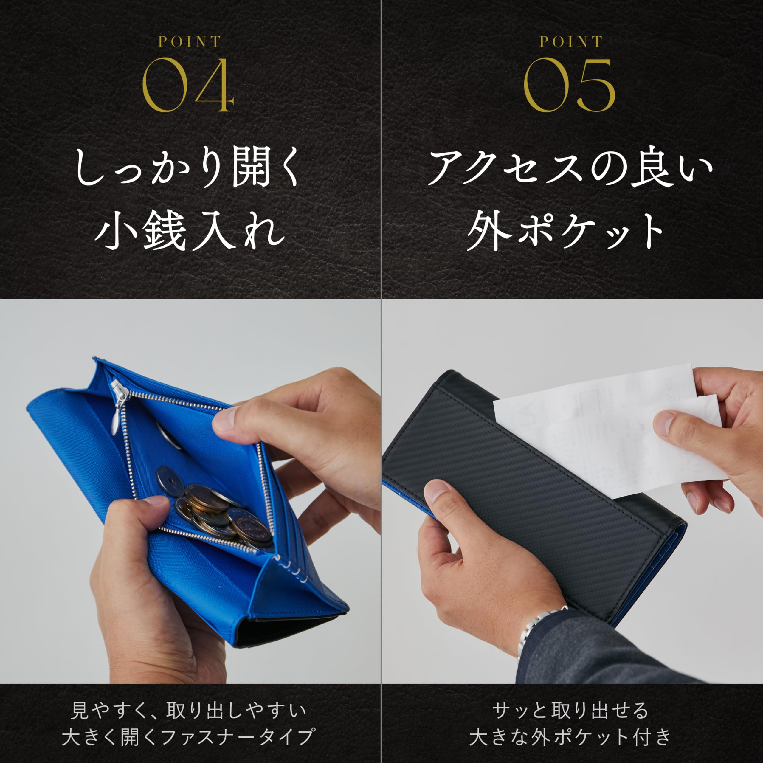 【スタイリッシュにカッコよく決まる】シックで高級感あふれるカーボンデザインを財布に取り入れることは重要である。財布に求められるものは、機能性とデザイン性だ。会計時に取り出す財布の持つ表情は、ビジネス・プライベートを問わず、持ち主の印象に影響を及ぼす。薄暗いデザインで丸く太ったパンパンの財布よりも、シックなブラックでスタイリッシュに決まるシャープな財布を使用することをお勧めする。財布一つ変えるだけで、周囲の視線や印象は驚くほど変わるものだ。
