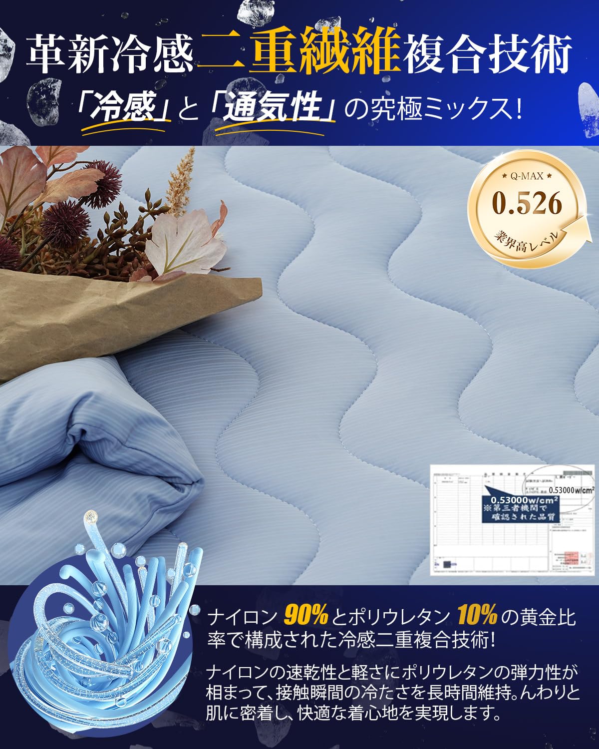 【極上冷感のタッチ】極冷感ひんやり敷きパッドは3D+7D中空綿入り中空锦職維の太さはデシテック (tex) で表します。数字が大きいほど、纖維が太くなリます。織維が太すぎるとバサバサになり、ふんわリ感がなくなります。逆に細す学るとペたリが生じやすいかさ高と通気性がなくなリます。試行錯誤の結果、3D中空締と7D中空締を一定の割合で混合して柔らかさと反発力を両立し、この軽くて暖かい布団が生まれました。