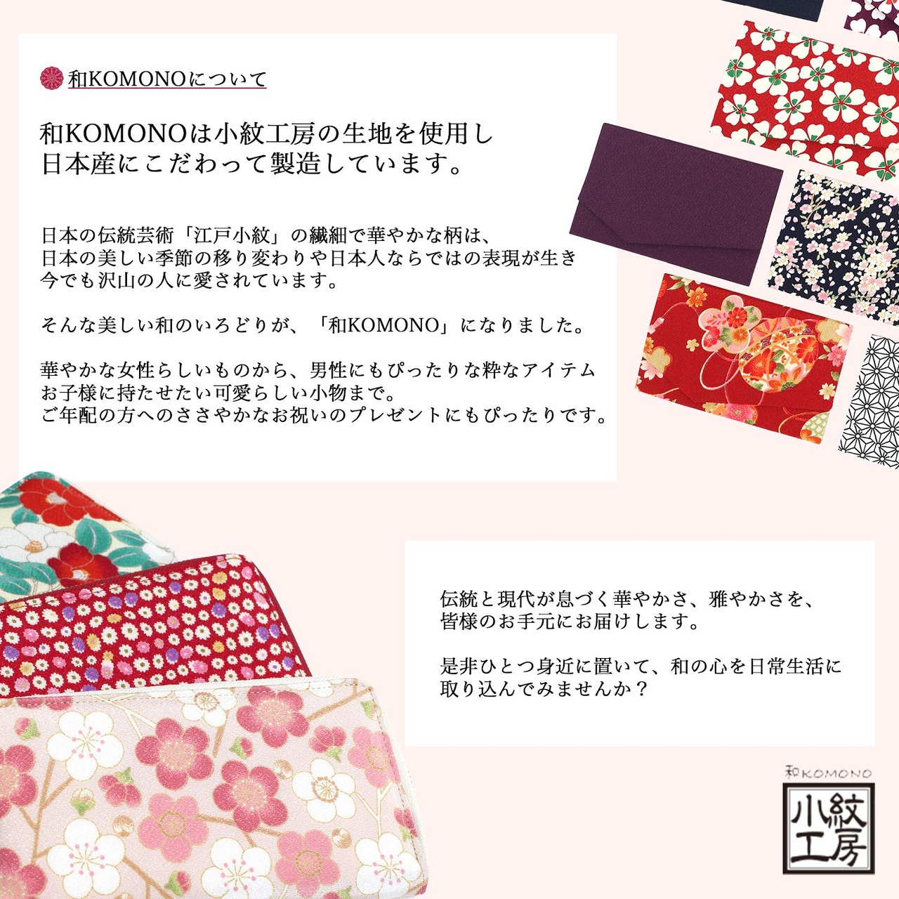 宇仁繊維社オリジナルの「和KOMONO」は、日本オリジナルにこだわり、京都や北陸の工場で生産した素材小紋工房二越縮緬R(商標特許)を使用して、京都の有名工房で「和KOMONO」として製品に作り上げたものです。