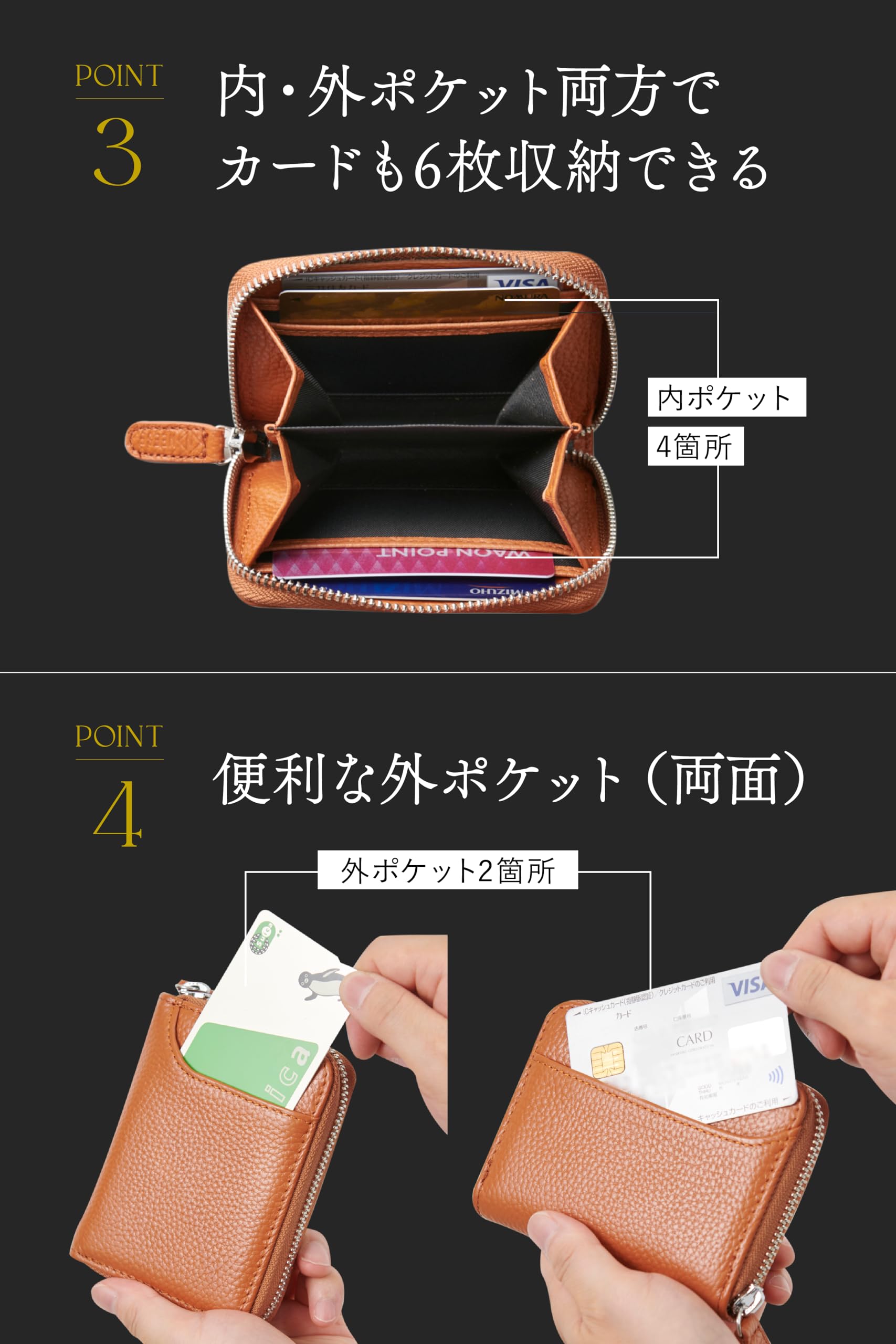 【detail】:お札は2つ折りで収納でき、小銭を取り出しやすいように大きく開きます。カードポケットはクレジットカード入れ × 4 に設定し、外ポケット × 2の構造で交通ICカード(suica nimoca pasmo nicoca)等々を収納したままタッチ通過できる小銭入れ付きパスケースや、とりあえずのレシートを入れにも。