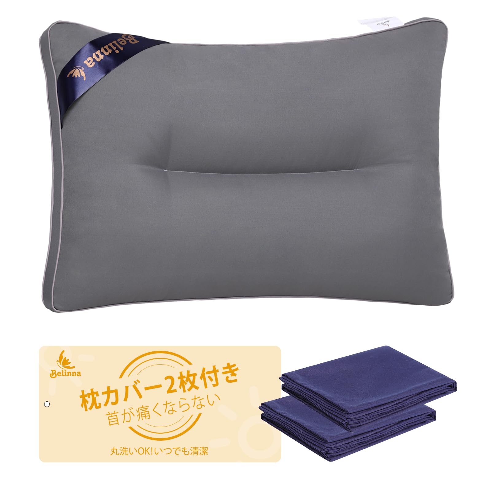 【在庫セール】低い枕 Belinna 枕 首が痛くならない 枕カバー 低反発 低め 柔らかい枕 安眠枕 首枕 睡眠枕 高さ調整可能 丸洗い可能 ストレートネック 枕 ブレインスリープ 枕 グレー (長さ63cm幅43cm高さ16cm)(ネイビーカバー2枚付き) | libertyislan