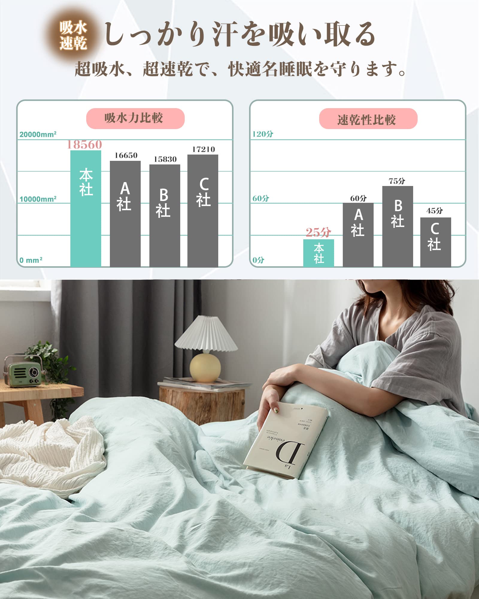 【吸水速乾 & 0秒吸水】かけ布団カバーは吸水速乾機能で汗をかいてもすぐに吸い取り、すぐに乾きます。サラッとした肌触りでベタつきません。快適に眠ることができます。乾きやすく、シワになりにくい素材なので気軽に洗っていつでも清潔にお使いいただけます。