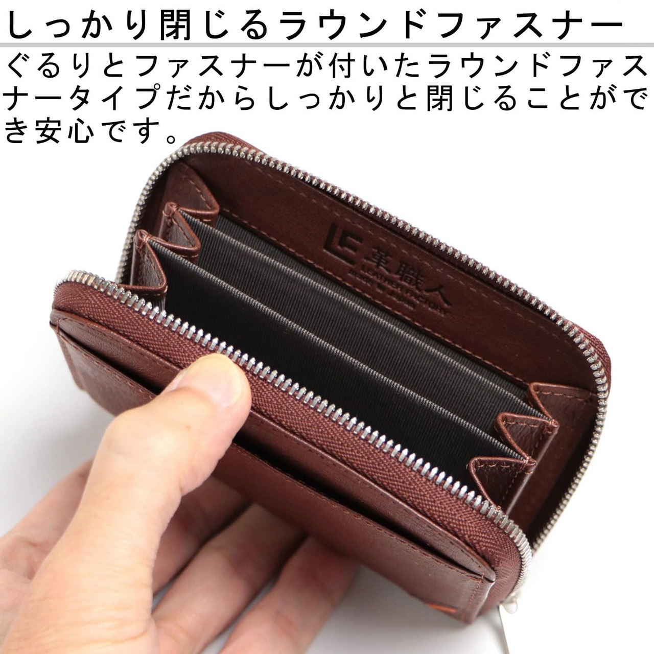 [種別] ミニ財布 小さい財布 ラウンドファスナー メンズ 財布 [サイズ(約)] 横11.3cm 縦7.8cm 厚さ1.8cm [素材] メイン:牛革(栃木レザー)、裏地:シャンタン生地 [重さ(約)] 66g [機能] マチ付きポケット×4、外カードポケット×1 [生産] 日本製