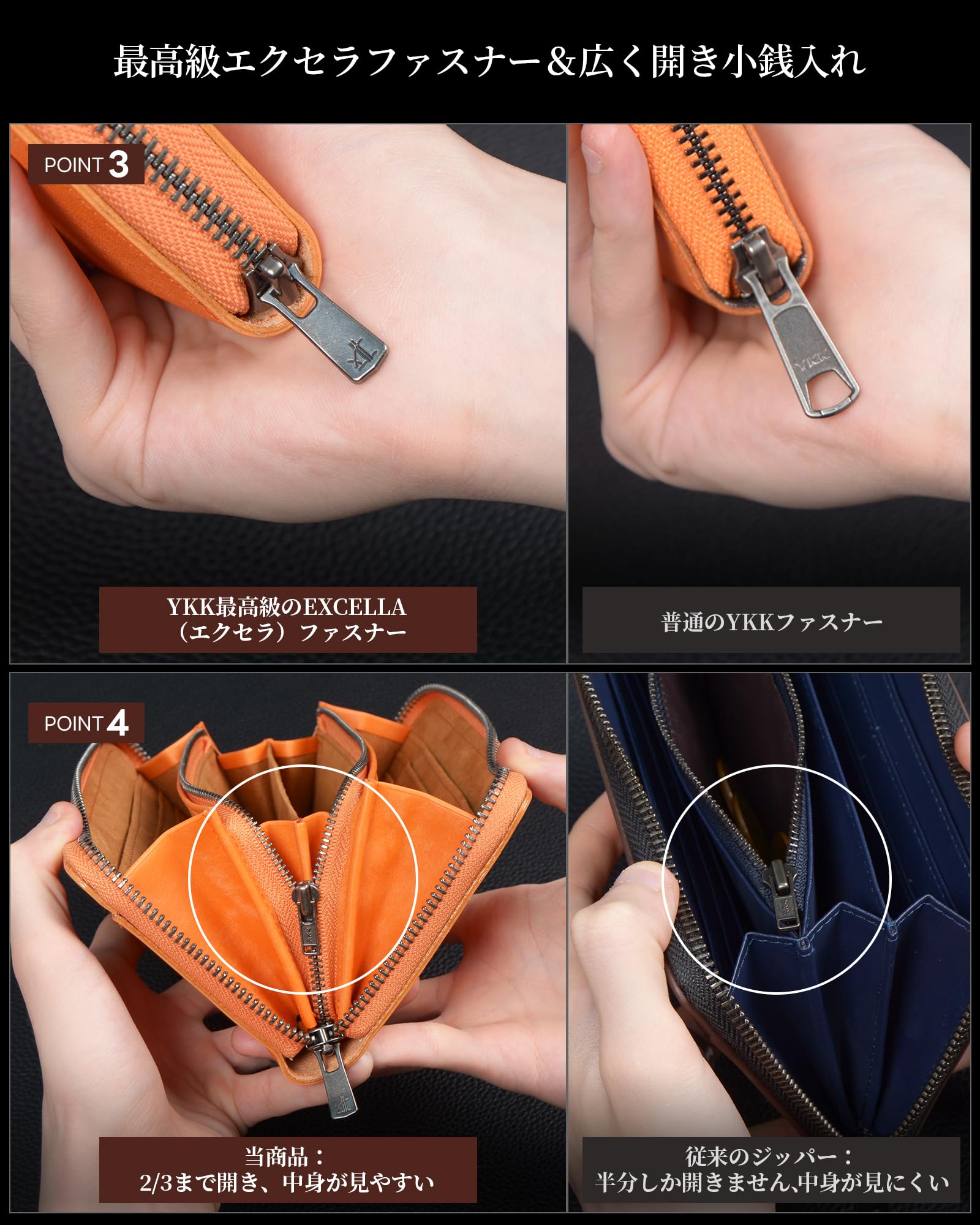 【YKKエクセラ、優れた耐久性と使用感】財布 メンズの品質を決める大きなポイントは、良いファスナーです。長財布の外側はYKK社のEXCELLA(エクセラ)ファスナーを使用しており、お財布をしっかり守ります。コインケースのファスナーは、従来の財布と比べて長めに設計されており、中身がみやすいし、コインを取り出しやすくなっています。