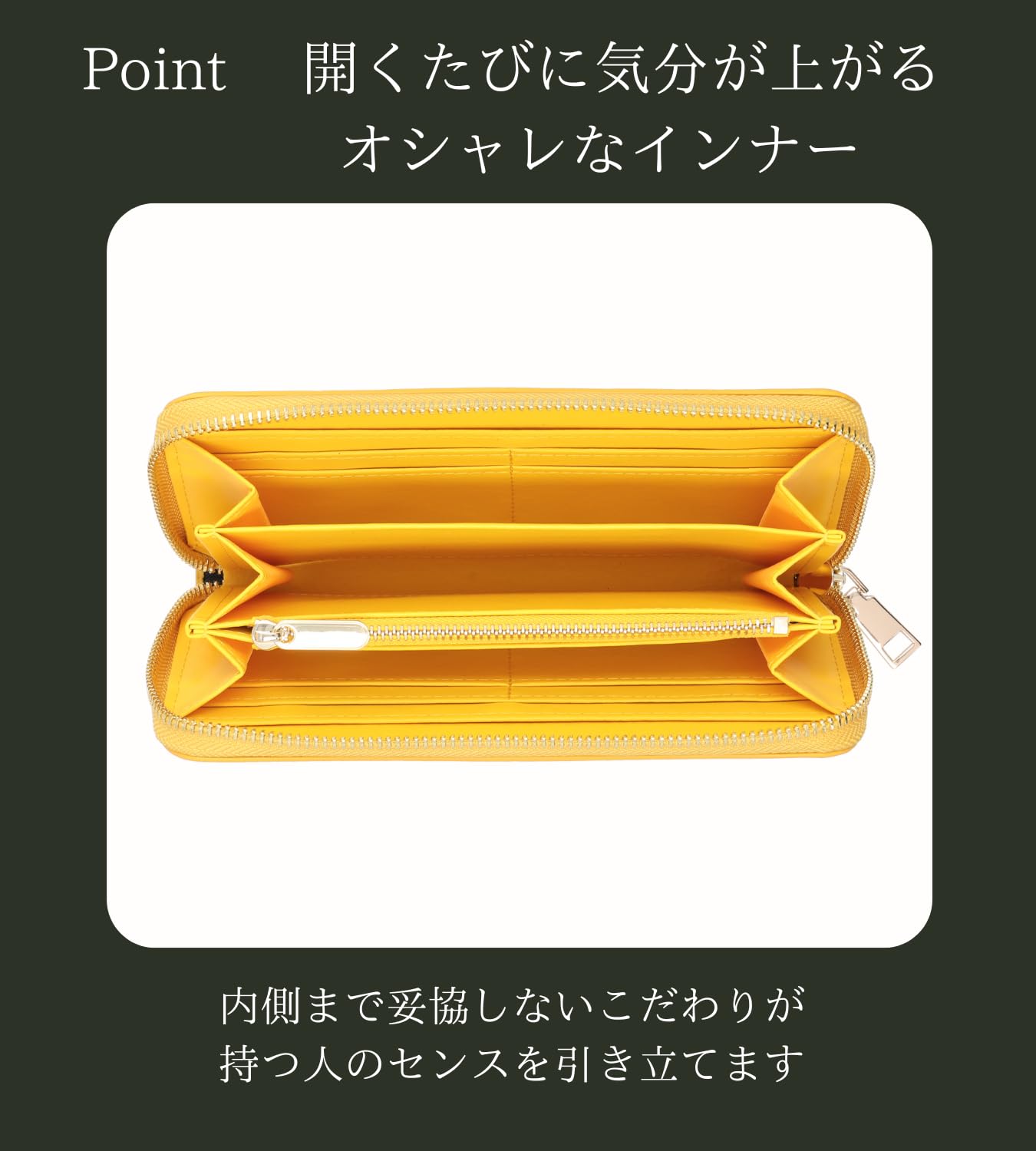 【使いやすいラウンドファスナー】開閉がスムーズなラウンドファスナーを採用。中身が見やすく、取り出しやすい設計で、日常の忙しさの中でもストレスフリーな使用感を実現します。