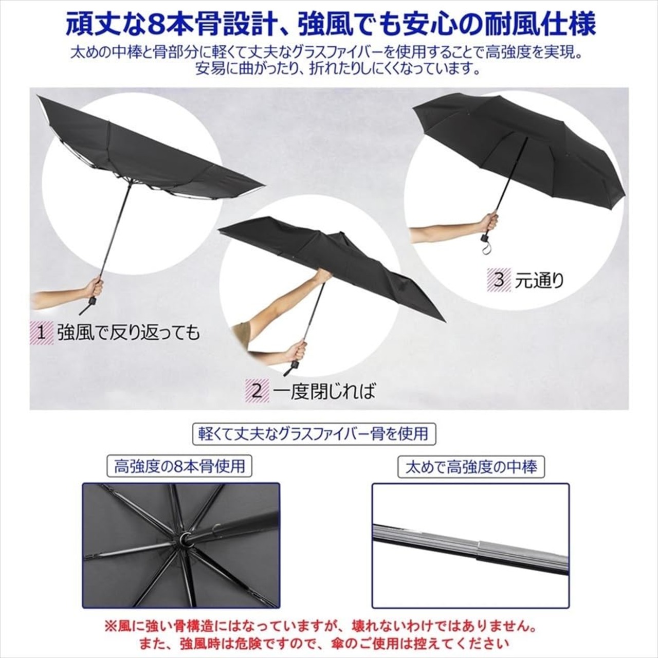 【濡れにくい大判サイズの122cm】折りたたみ傘ですが、開いた時のサイズが約122cmと非常に大きくなっています。サイズ感としては通常の大判紳士傘と比較しても遜色ない仕様なので、荷物を持ってさしていてもほとんど濡れません。また、折りたたむと30cmほどのサイズなので、カバンなどに入れて持ち運びしやすくなっています。また、太めのバンドになっているので、傘は大きいですが、留めやすくなっています。