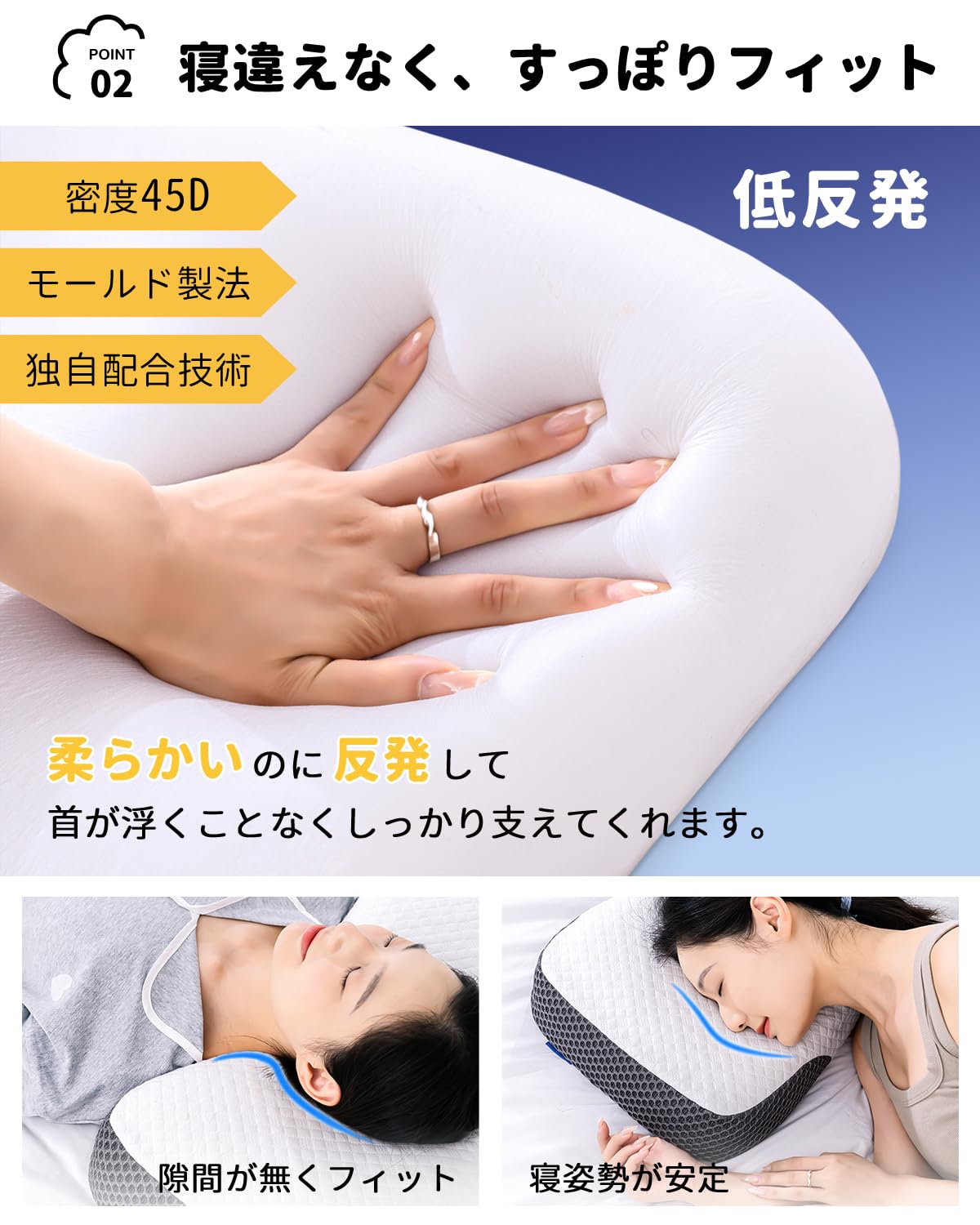 【寝違えなく、スポッとはまる】モールド製法と独自配合技術で作られた低反発枕。触った感じは柔らかいのに、頭をしっかり支えてくれます。密度45Dもあり、耐久性が長いです。どんな体勢になっても、すっぽりと枕に収まって、寝姿勢が安定し、枕から落ちることがないです。特に寝違えやすい方にお勧めです。