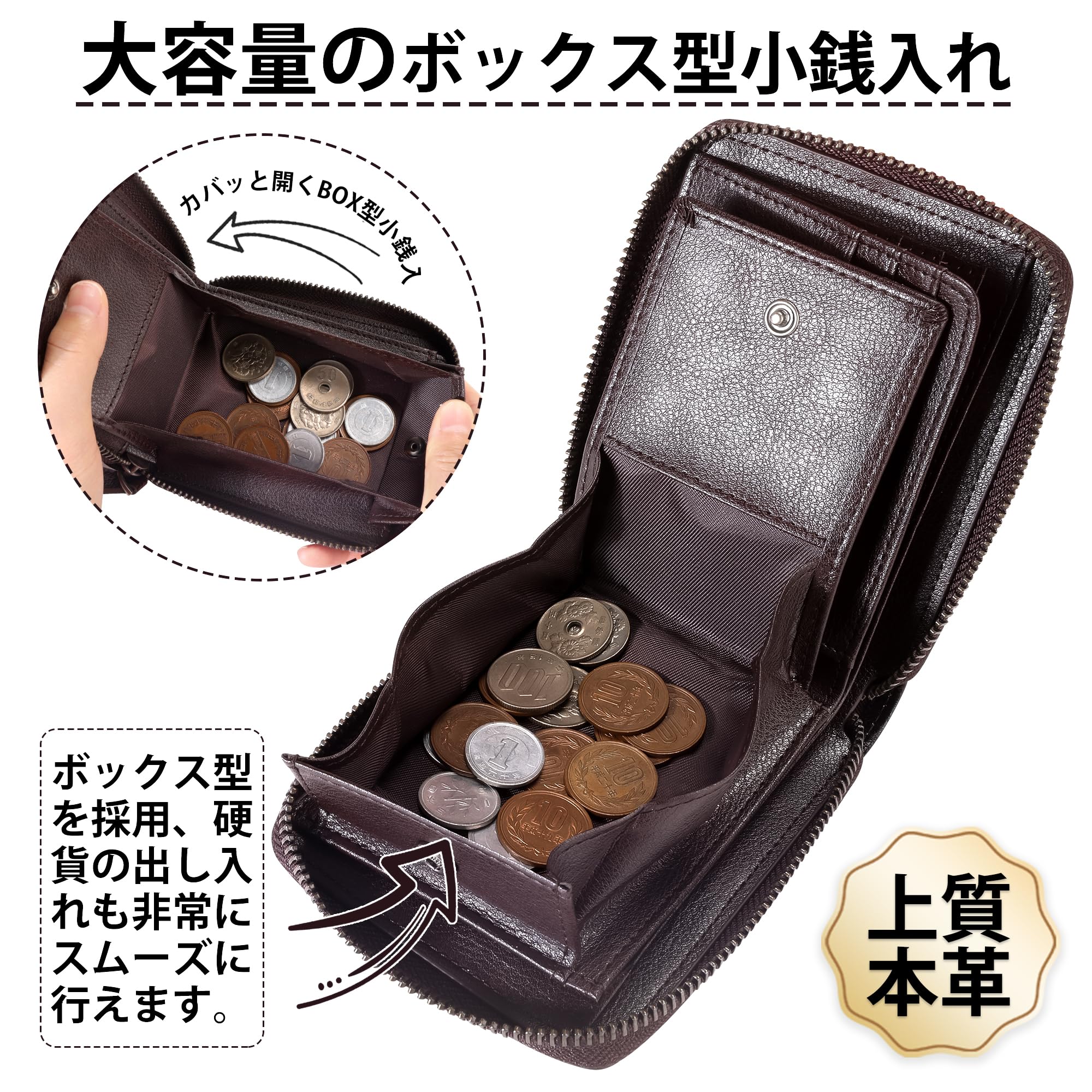 【コンパクト 持ち運びやすく 小銭入れ】男性用の財布として、シンプルでエレガントなデザインが魅力的で、さらに高品質な本革素材を使用しており、手触りがとても良いです。コンパクトなサイズながらも、現金、カード、小銭を簡単に収納できる実用的な設計がされています。お札は折れないし出し入れが大変しやすい。コンパクト、大容量さに特化した小さい財布です、日常使いにとても便利です。素材:本革 、サイズ : 12.5㎝ × 10㎝ × 2.5㎝、重量:約120g。収納:札入れ×2、BOX型小銭入れ×1、カード入れ×11。