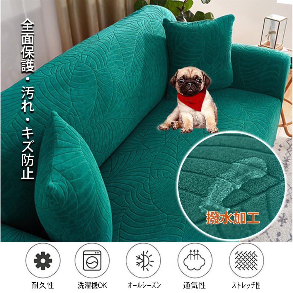 ソファーカバー 肘付き 3人掛け 撥水加工 葉紋様 ソファーシート クッションカバー1枚付 滑り止め 汚れ防止 傷防止 爪とぎ防止 耐久性 通気性 伸縮性 ソファーパッド 洗える ソファーマット ソファシート マルチカバー 四季適用(エメラルドグリーン 195*230)