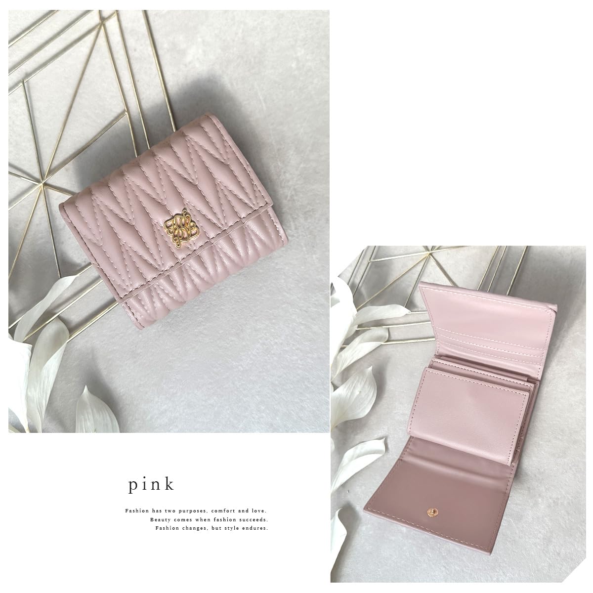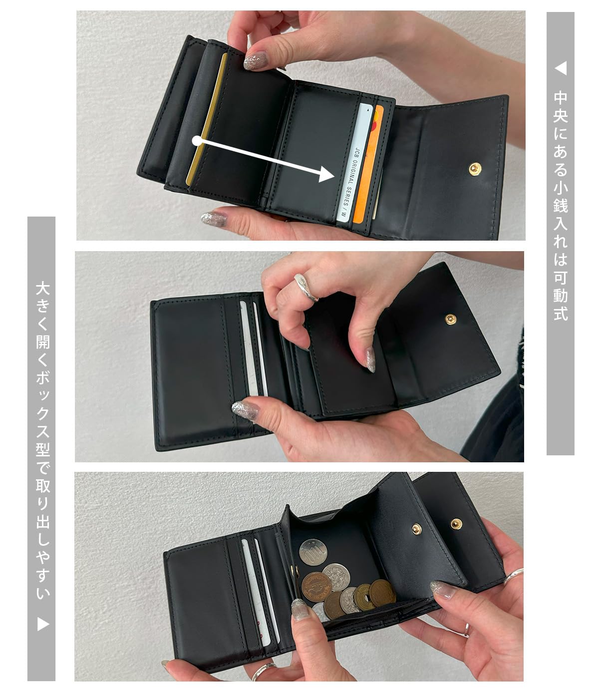 コンパクトなデザイン: 小さくてコンパクトなサイズで、持ち運びに便利な三つ折り財布です。L字型に開くので三つ折り財布にありがちな「お札の折れ曲がり」を気にせず収納することが可能です
