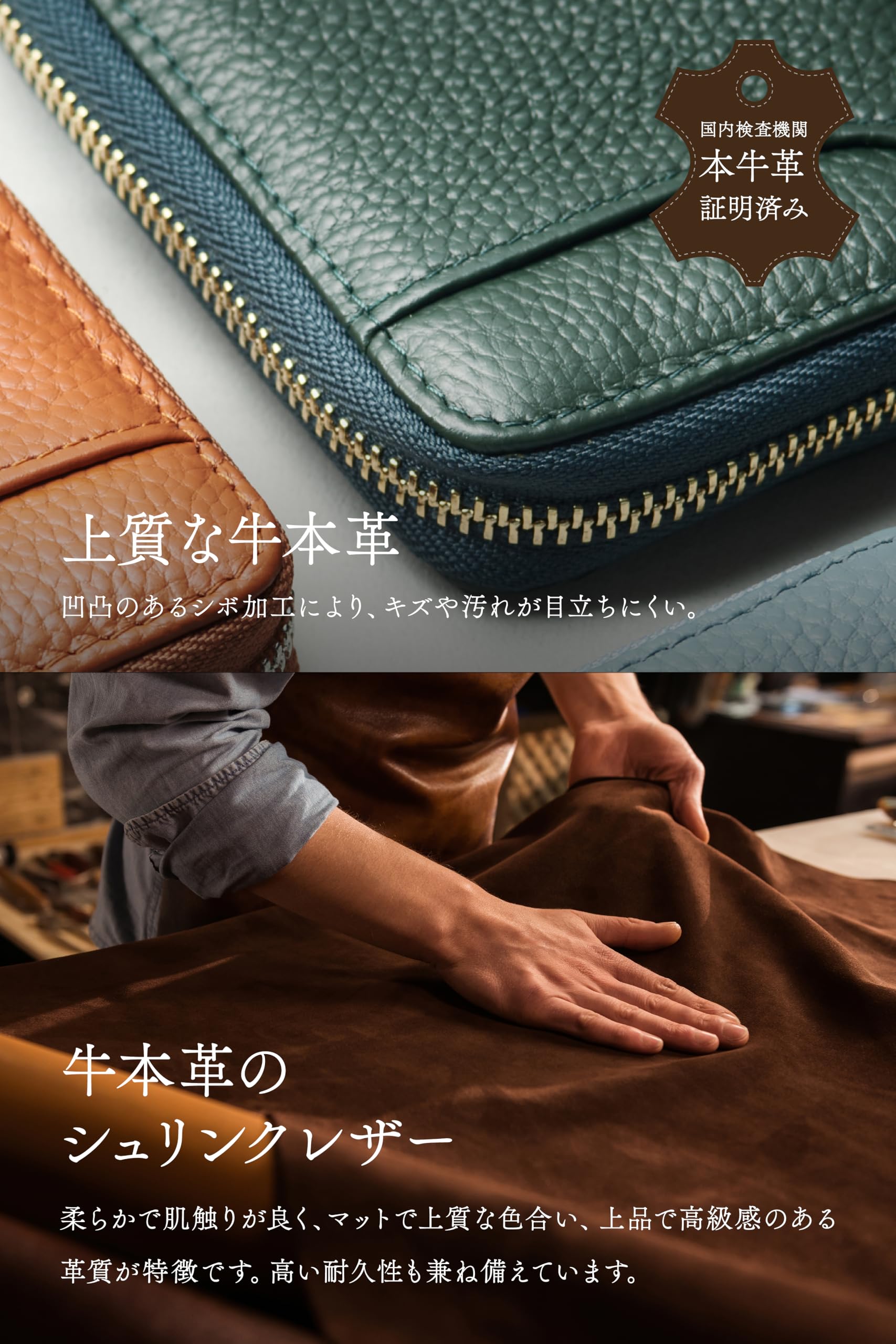 【本革】:一般財団法人 日本皮革研究所にて本革と認定された天然皮革を贅沢に使用しキズやシワなどが目立ちにくいシュリンクレザーを採用(シュリンクレザーとは凹凸の形で型押しし表面をコーティング加工した革です)。