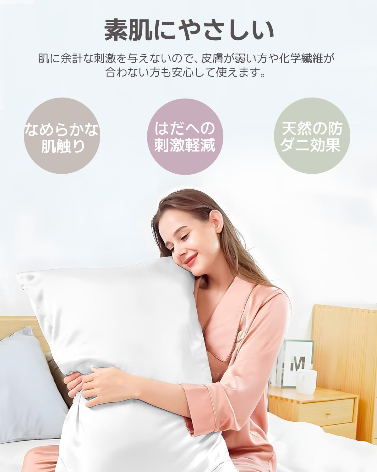 【素肌にやさしい】肌へのこだわりが深く、毎日の睡眠時にも肌を大切にします。当社のシルク枕カバーは、その滑らかな肌触りと低摩擦性で、睡眠中の肌への刺激を最小限に抑えます。少し寝返りを打つだけでも起こる摩擦を減らし、肌荒れやシワの原因となる刺激を軽減します。天然タンパク質と人肌に極めて近いアミノ酸成分が豊富に含まれており、敏感な肌の方や赤ちゃんでも安心してご使用いただけます。