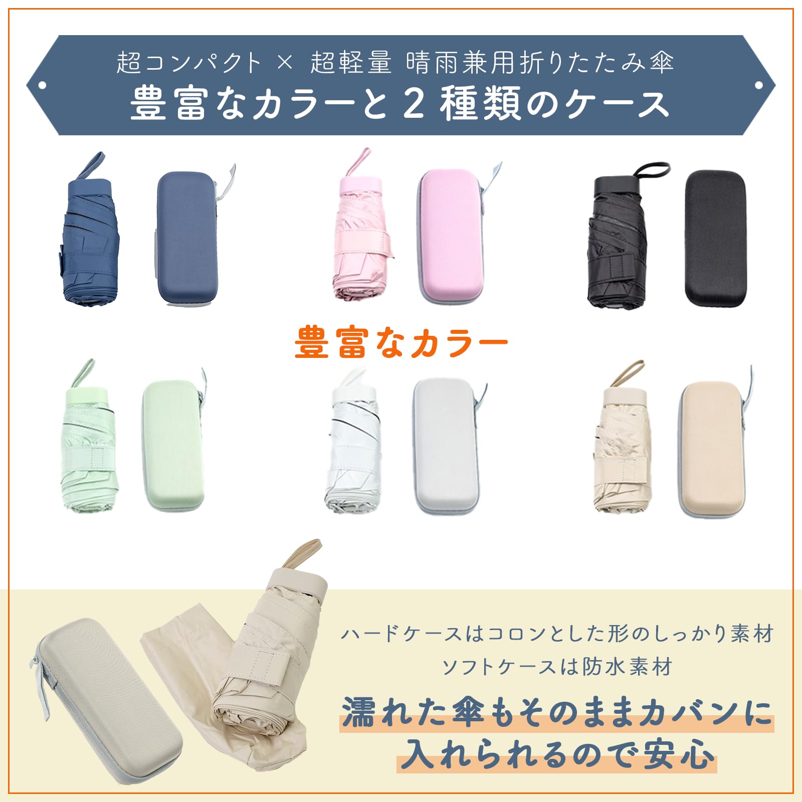 【実用的な2種類のケース付き】コロンとした形が可愛いハードケースと防水ソフトケースの2種類のケースが付属。濡れた傘もそのままカバンに入れて持ち歩けます。ハードケースはペンケースのようなしっかりさで他の用途にも使用可能。