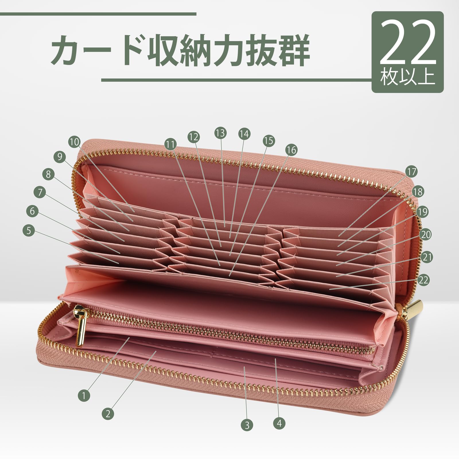 このレディース長財布は、上質な本革で作られ、多機能で大容量です。約10cm×20cm×2.8cmのサイズで、重さは約280g。ファスナーがサイドまで開く小銭入れや、最大22枚のカードを収納できるカードポケット、お札を入れるための札入れなど、抜群の収納力を誇ります。また、YKKファスナーを採用しており、使い心地滑らかで安心の耐久性を実現しています。ピンクの無地で、女性に人気のデザインです。