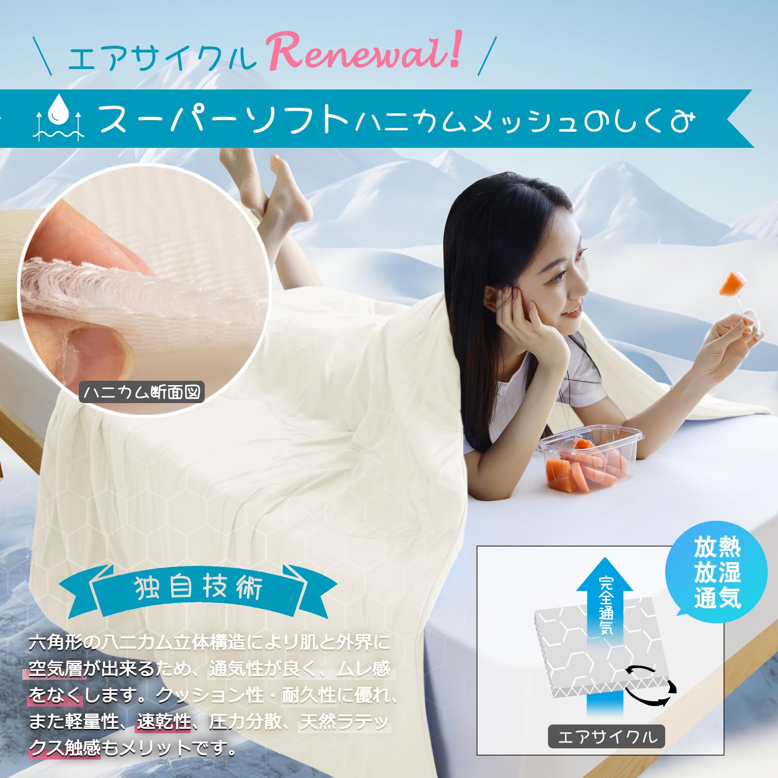 【詰め素材もこだわりの新感覚を】夏用掛け布団の中身には、新開発のスーパーソフトなハニカムメッシュ素材を使用。一般的な綿入りの夏布団とは異なり、ハニカム構造は立体六角形で、寝ている間に体温と湿気を素早く発散させ、空気層を形成してエアコンの冷気を保持します。暑い夜でも涼感を保ちながら快適な眠りをサポートします。さらに、軽量性、通気性、速乾性に優れ、圧力分散にも効果的。天然ラテックスのような触感で、寝心地も非常に快適です。涼感夏布団があなたの体と心を癒し、快適な眠りへと導きます。