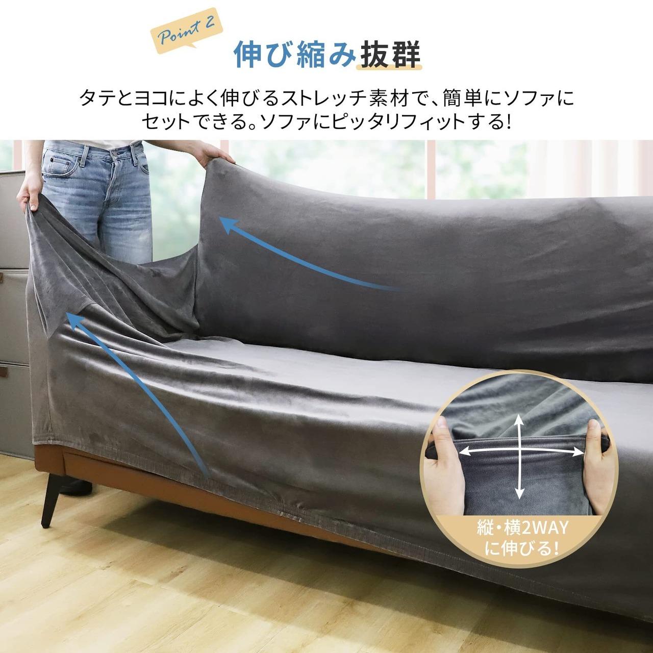 「固定パイプ付きズレ防止」固定用パイプ(2人掛け:固定パイプ4本 3人掛け:固定パイプ5本)が付き、それをソファの座面と背もたれの間の隙間に押し込んで使って、カバーがさらに固定され、形も整ってズレるのを防止します。座ったり立ったりする際のズレや、座り心地を悪くするたゆみなどのストレスを軽減するため、座り心地がよくなります。