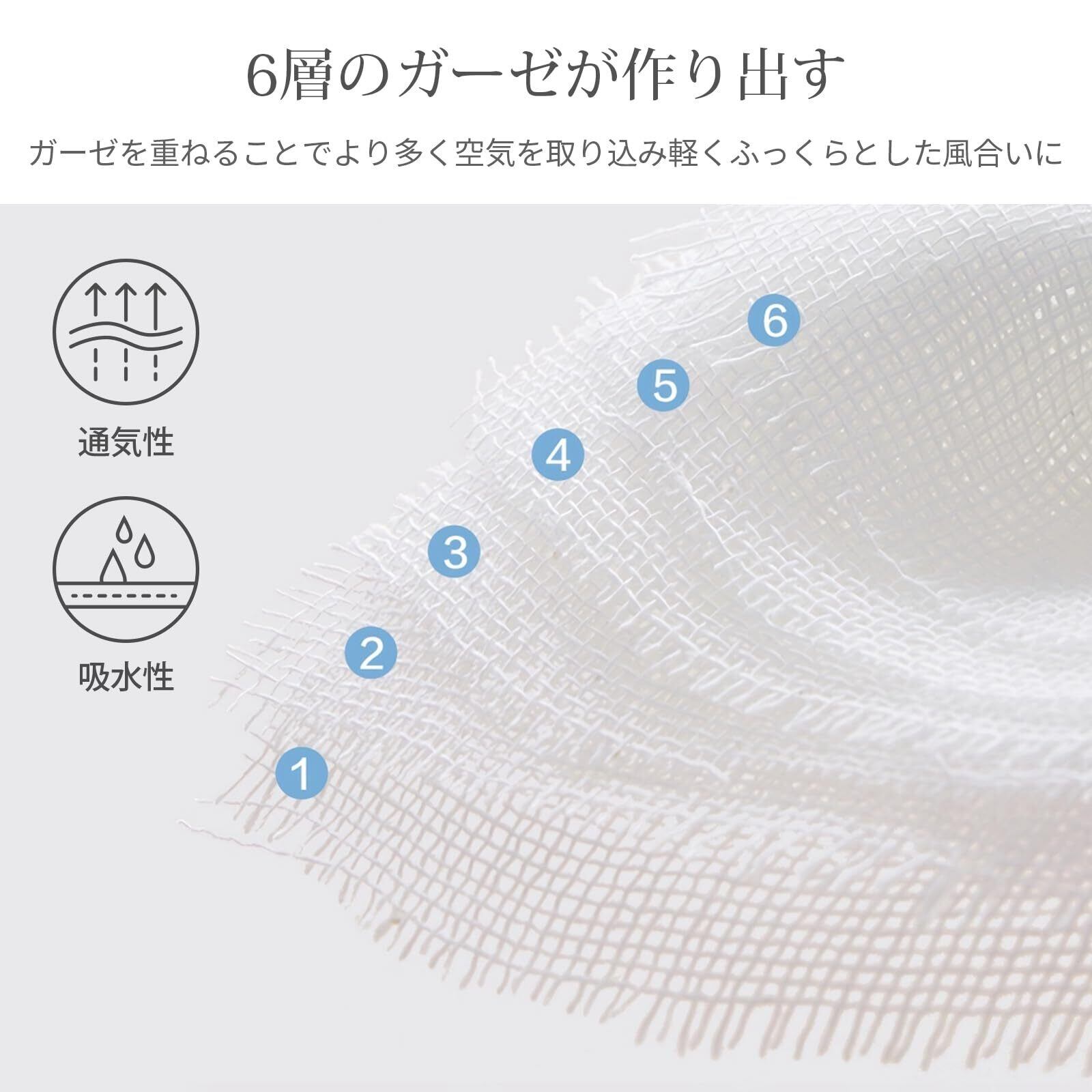 【冷房対策】心地よい眠りを誘う6重ガーゼ。ガーゼ生地を6重にしたことでやわらかい肌触りと、適度な通気性を実現。春から夏にかけて長くお使いいただけます。夏場の冷房対策、熱帯夜でも快適にお使いいただけます。