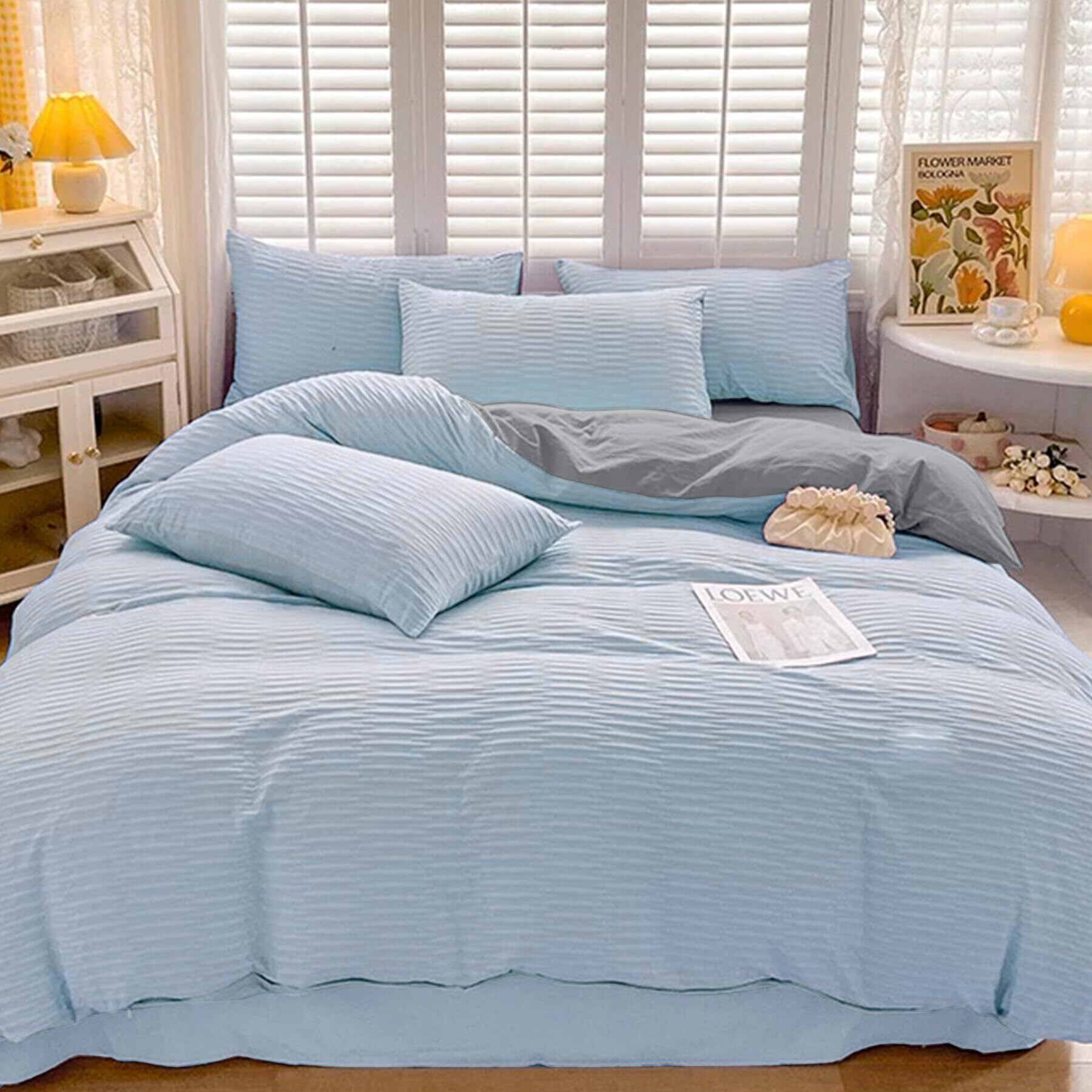 【特価セール】布団カバー AYO シングル 3点セット寝具カバーセット 洋式ベッド・和式布団兼用 掛け布団カバー ボックスシーツ 枕カバー ベッド用 シアサッカー生地 布団用 優しい肌触り柔らかい 洗い替え 速乾タイプ ピーチスキン加工 四季通用(ブルー+グレーシングル) | libertyislan