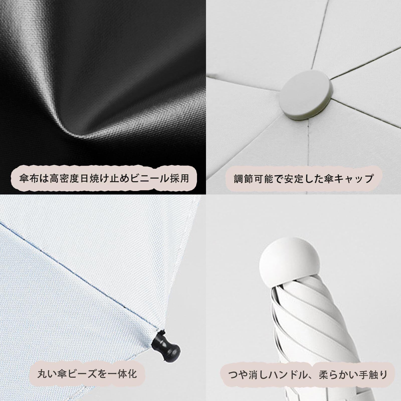 【完全遮光 & UVカット】多層遮断生地で加工され、遮光率・UVカット率ともに100%、紫外線防止指数最高値UPF50+を実現し、日差しからお肌を守ります。炎天下でも強い紫外線を反射してまったく通さず、傘の裏地は黒で地面からの照り返しを吸収するので顔にあたりづらくなるので、顔の日焼けも防いでくれます。