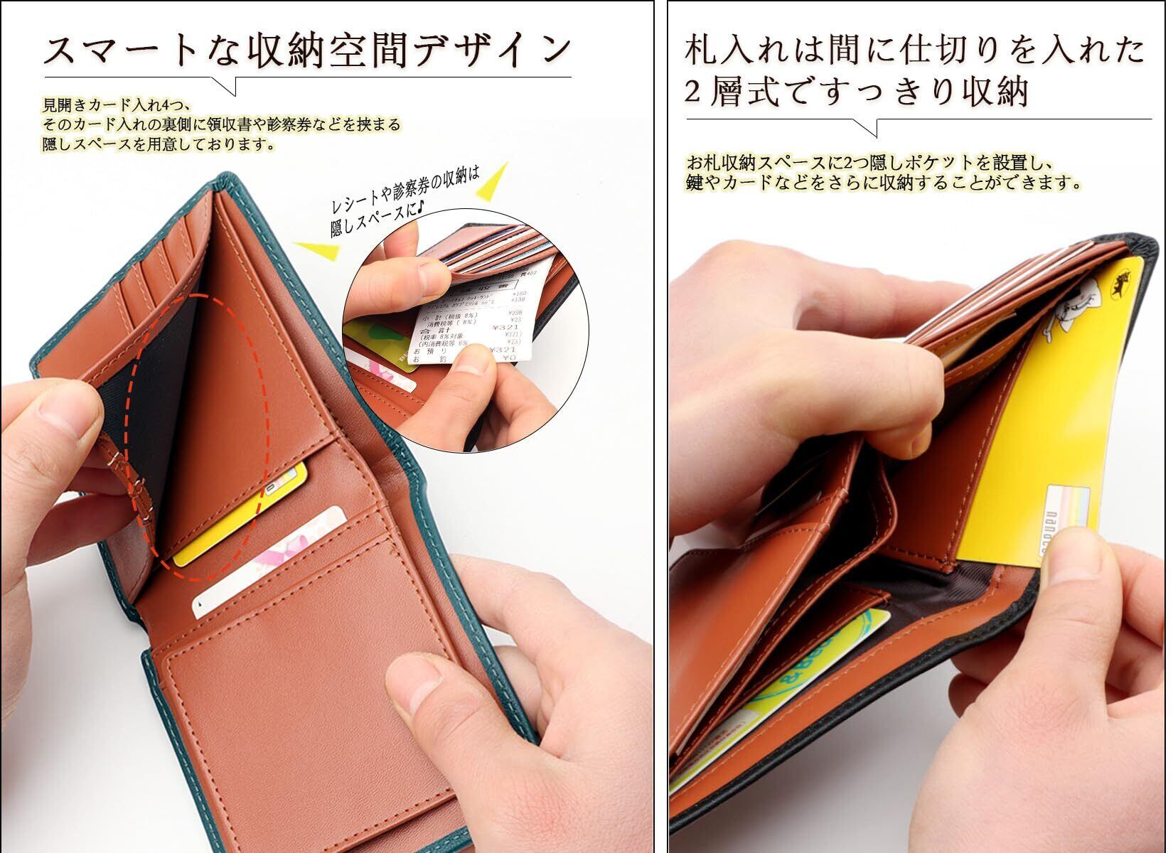 【何度もサンプルを重ねて改良しながら作ったお客様目線の2つ折り財布】「財布の容量が全然足りない」「お支払い時の小銭探しが大変」という多くのお客様の声を参考に改良し続けております。❶見開きカード入れ4つ、そのカード入れの裏側に領収書や診察券などを挟まれる隠しスペースを用意しております。❷札入れは間に仕切りを入れた2層式で紙幣とレシートを分けて収納。❸お札収納スペースに2つ隠しポケットを設置し、鍵や小物などをさらに収納することができます。❹ボックス型小銭入れの閉じフタを広く作ったため、コインがこぼれにくくなり、力入れずストレスなく開けることも可能です。