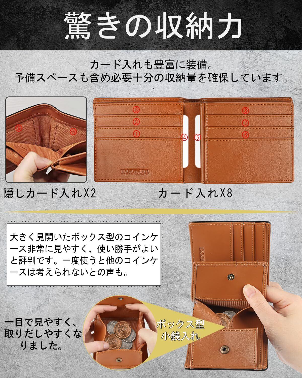 『 財布スペック』サイズ : 11.5㎝ × 9.5㎝ × 2㎝、重量:約100g。収納:札入れ×2、BOX型小銭入れ×1、カード入れ×10。