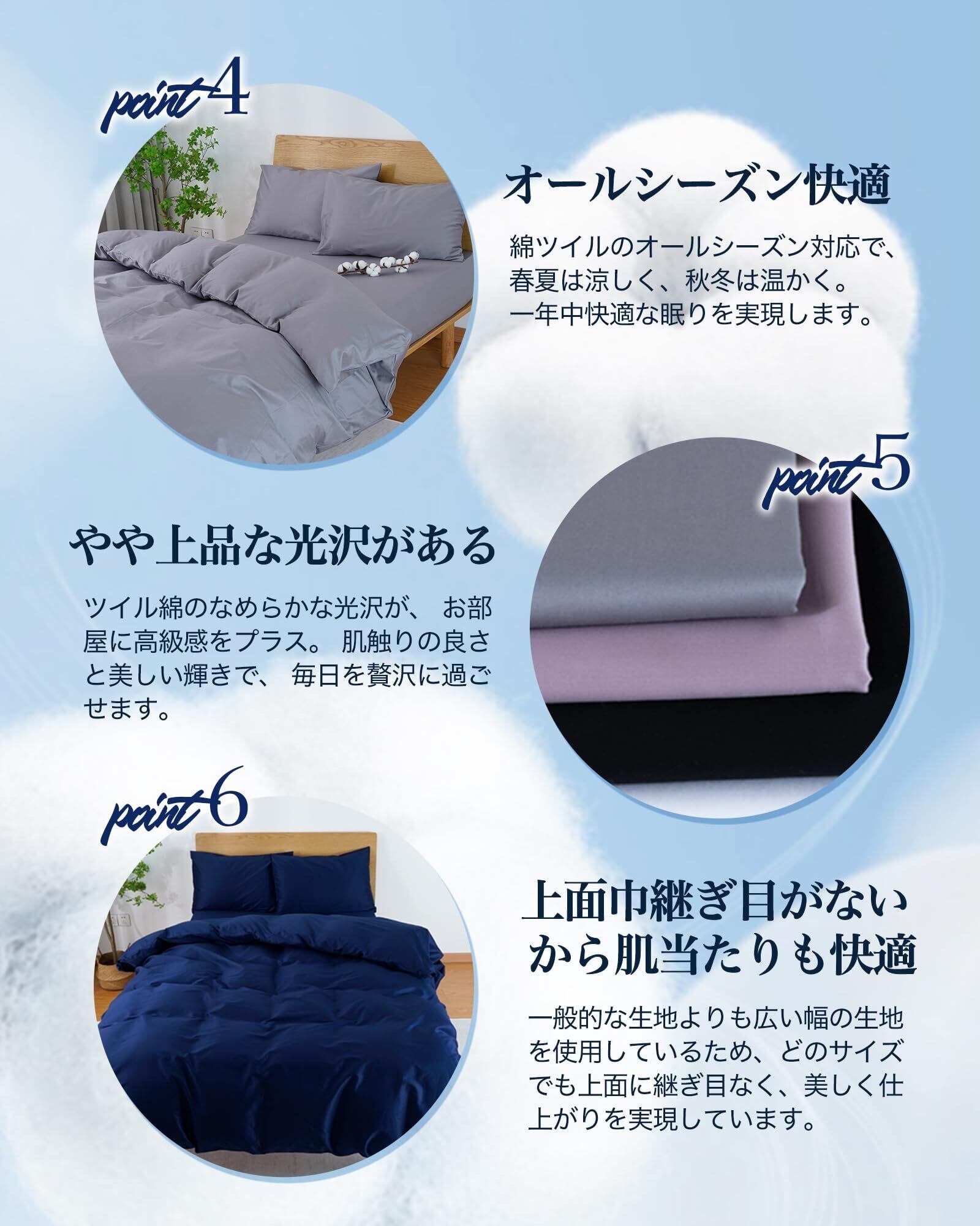【使いやすいデザイン・仕様】布団カバー シングル 綿100%:150x210cm ①片側に上下開くダブルファスナー使用 ②布団留めスナップボタン8箇所付き この布団カバーは使いやすさを追求した設計で、カバーの片側には全開ダブルファスナーがあり、スナップボタン8箇所で布団を固定できます。お手入れが簡単なので、お忙しい方の強い味方です。一人暮らしの方や衣類のお手入れが難しい方に便利です。 【オールシーズン大活躍素材 洗濯機対応】コートン100%の掛け布団カバーは暑すぎず寒すぎず、保温力が適度にあり、洗濯を重ねて使い込むほど、素材の柔らかさが増やします。春用、夏用、秋用、長い季節に心地よく使えます。<洗濯機で丸洗いOK>:家庭用洗濯機での丸洗いが可能。速乾性に優れ、洗濯ネット使用でわたズレなし。常に清潔で、メンテナンスも簡単です。