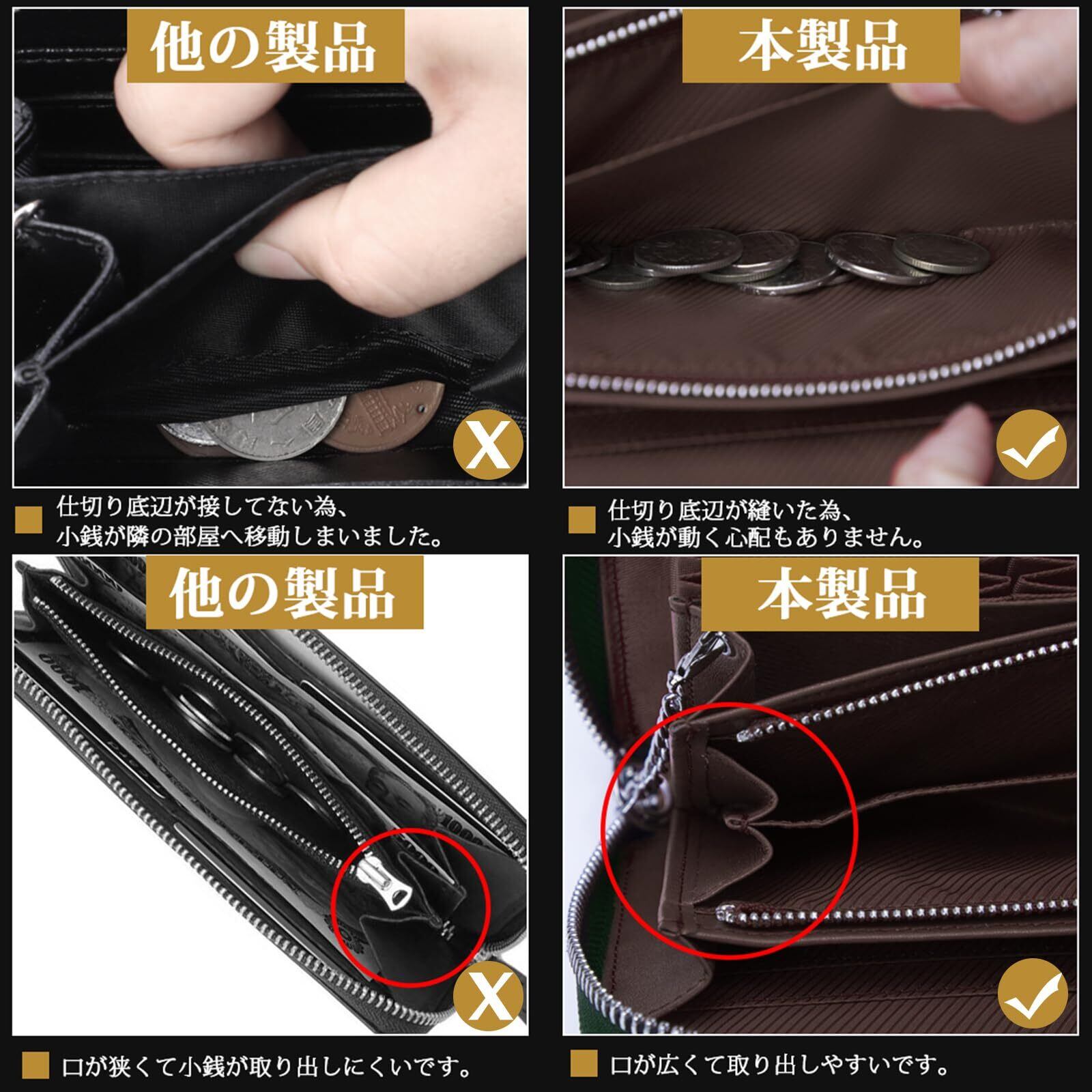 選ばれる理由:蛇腹式カードケース採用ので、カードだけで23枚以上は入るがことできます。更に、全ての個所にカードを入れましたが、全然厚みが変わらないです。②ラウンドファスナー使用で、ファスナーを開けばすべてが一目瞭然で、カードやお札が取り出しやすくとても使いやすいです。③通常の約1.5倍のコストをかけYKKファスナーを採用した、抜群の耐久性·開閉のスムーズさともに段違いに性能アップ!④小銭入れが2か所に分かれていて、圧倒的に選びやすくしたセパレート型を採用したので、小銭が散乱しないし、取り出し易います