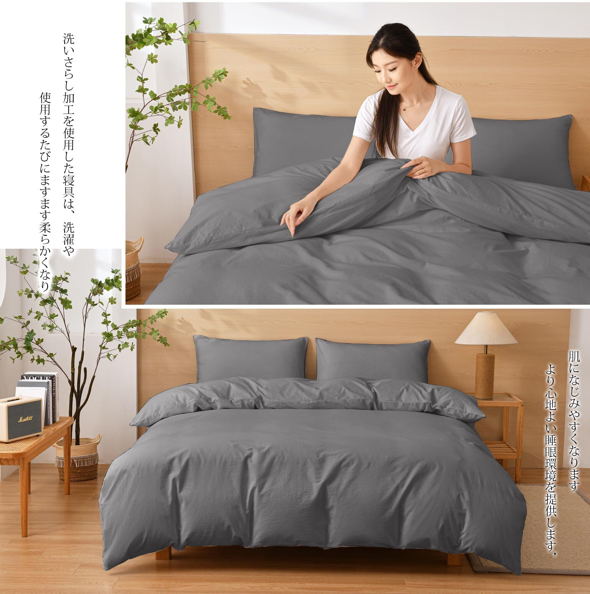 【新春セール】AYO 寝具カバーセット 布団カバーセット 洗いざらし シワ加工 水洗い やわらか (掛け布団カバー ボックスシーツ 枕カバー)吸水速乾 丸洗いOK 肌に優しい 無地 シンプル オールシーズン(シングル・3点セット ダークグレー) | libertyislan