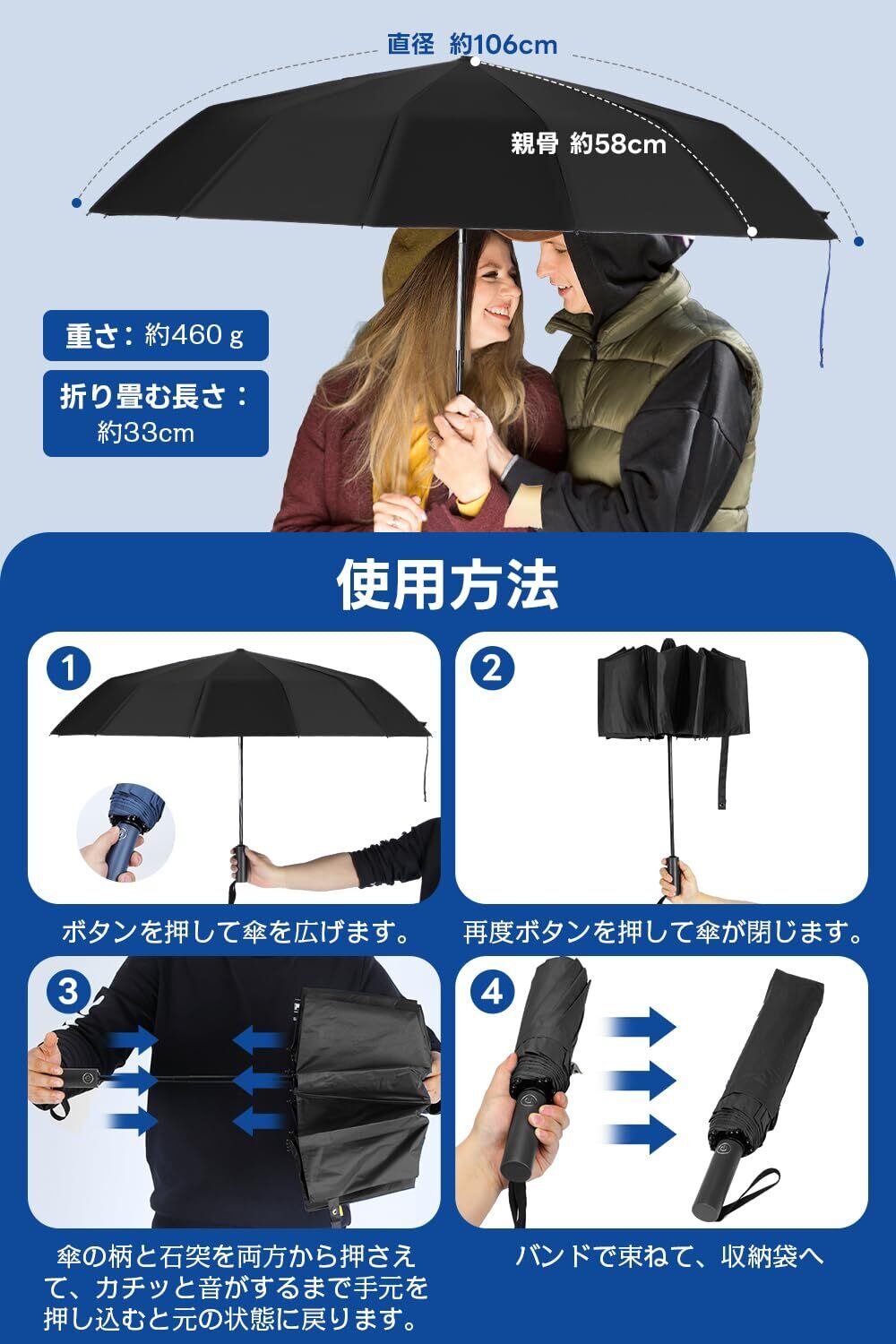 【ワンタッチ自動開閉&男女兼用】 折りたたみ傘 ワンタッチで自動開閉できる便利な設計で、片手で簡単に操作できます。車の乗り降り時や荷物を持っているときでも、スムーズに開閉できるため、ストレスなく使用可能です。大きめの折り畳み傘は男女を問わず、通勤、通学、旅行,出張など、様々なシーンで活躍します。折りたたみ傘は大きいサイズなのでメンズにもレディースにも使用できます。