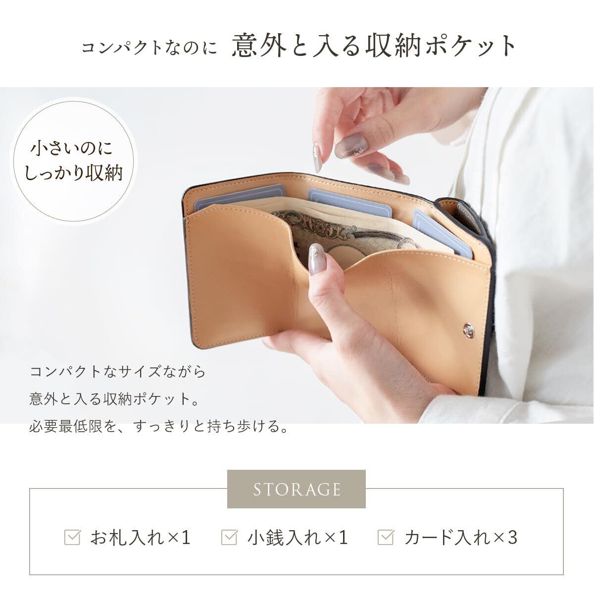 【収納力とコンパクトさを両立】無駄のない三つ折り設計に、ボタン型の小銭入れの組み合わせ。 カードもしっかり6枚収納可能。