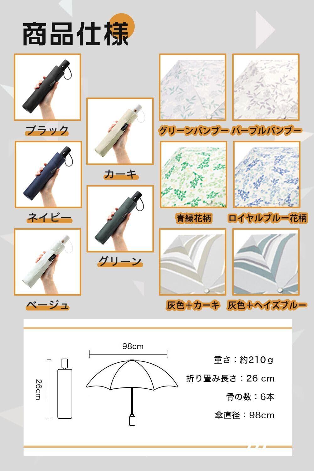 「軽量設計・携帯便利」約210g~220gの軽量化を実現しました折り畳み日傘!軽くてコンパクトで持ち運び便利、カバンに入れて常備しても負担になりません。また、無地のデザインなのでビジネス用としてもおすすめです。通勤、通学、旅行、出張などに適しています。