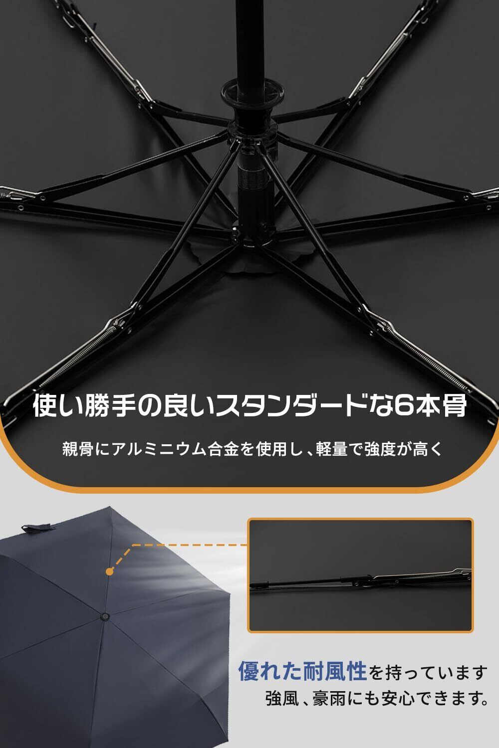 「頑丈な骨・耐風」頑丈で耐久性のあるグラスファイバー製傘骨を6本使用しており、強風を受け渡し、親骨の柔軟性と耐久力を向上しました。アルミニウム合金製の骨組みで、頑丈で錆びにくいです。強風、豪雨にも安心できます。