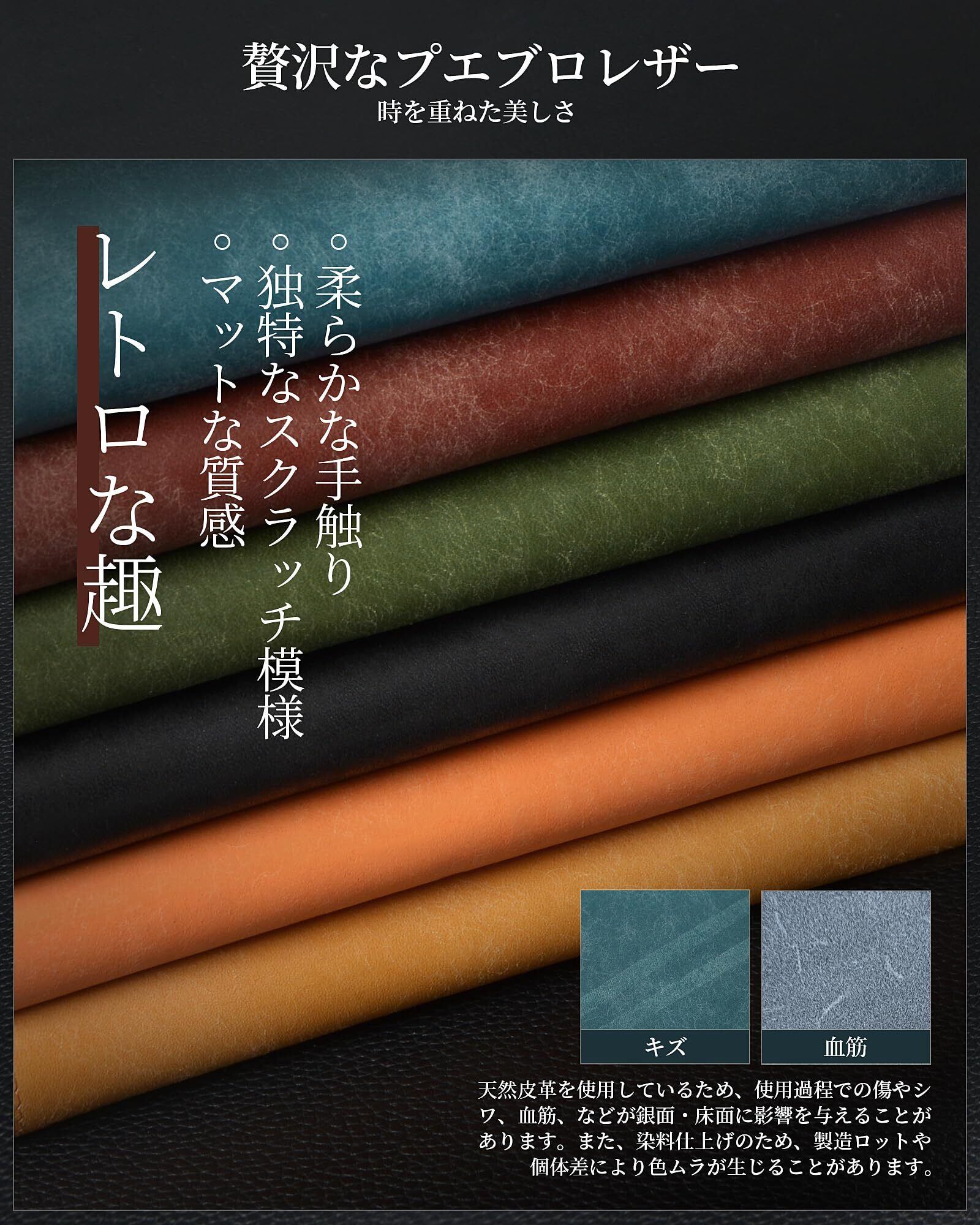 【最高級プエブロレザー長財布】プエブロレザーは、マットな質感と独特なスクラッチ模様が特徴で、自然で不規則な風合いが魅力的です。表面には細かなザラつきがありながら、手に触れると驚くほど柔らかな感触を楽しめます。その佇まいは、ヴィンテージの趣を感じさせつつ、天然革ならではの素朴で力強い表情を持っています。