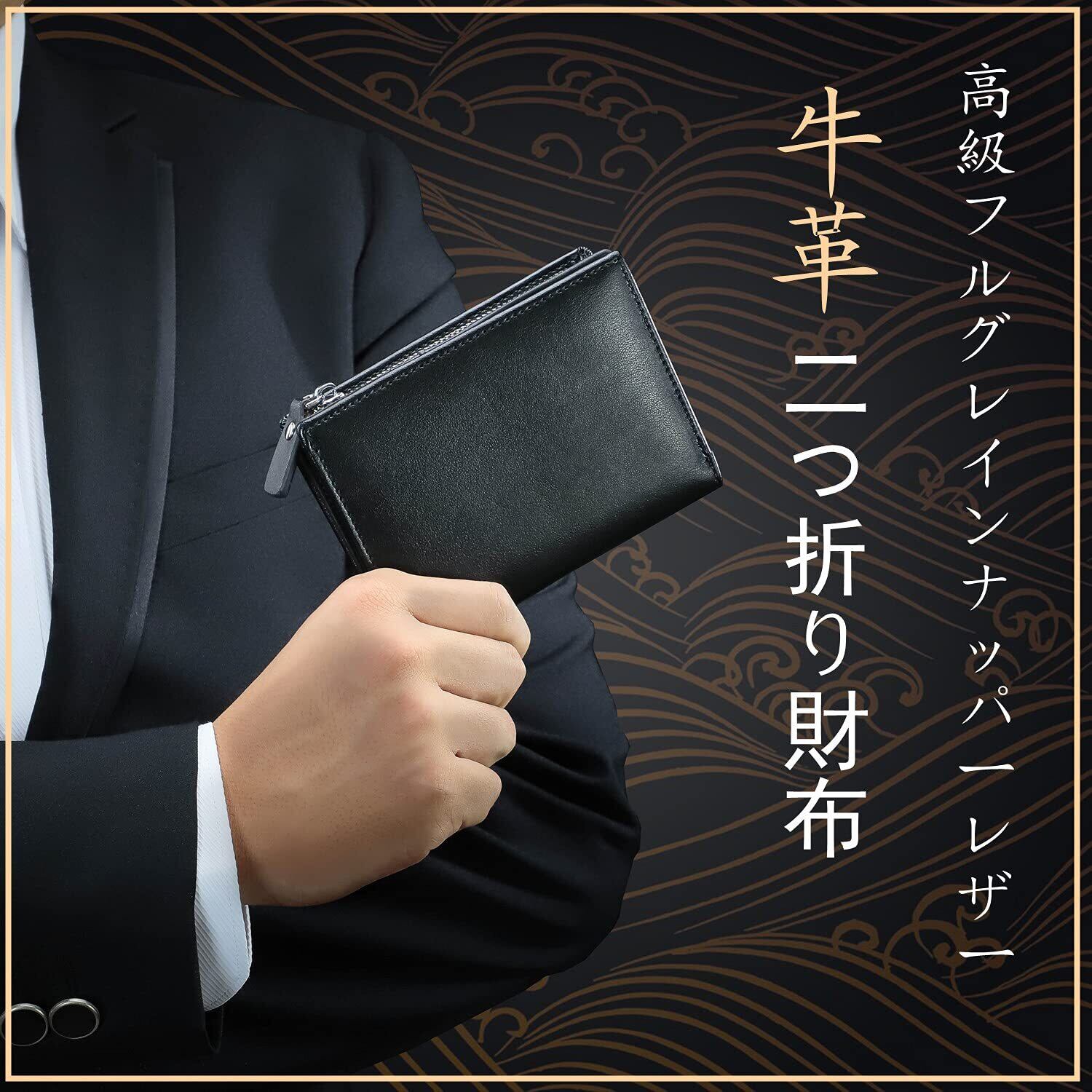 【 高級皮革( 牛革 )の採用 】 高品質贅沢革を使用し、見た目にも高級感があります。インナーにはマイクロファイバー生地を採用し、優れた耐摩耗性を持って、シワになりにくいです。人気のカーボンレザーの中でも、しなやかで耐久性のある高級革を使用。水にも強い素材なので雨の日でも安心。男性用の財布の中でも人気の二つ折り財布。