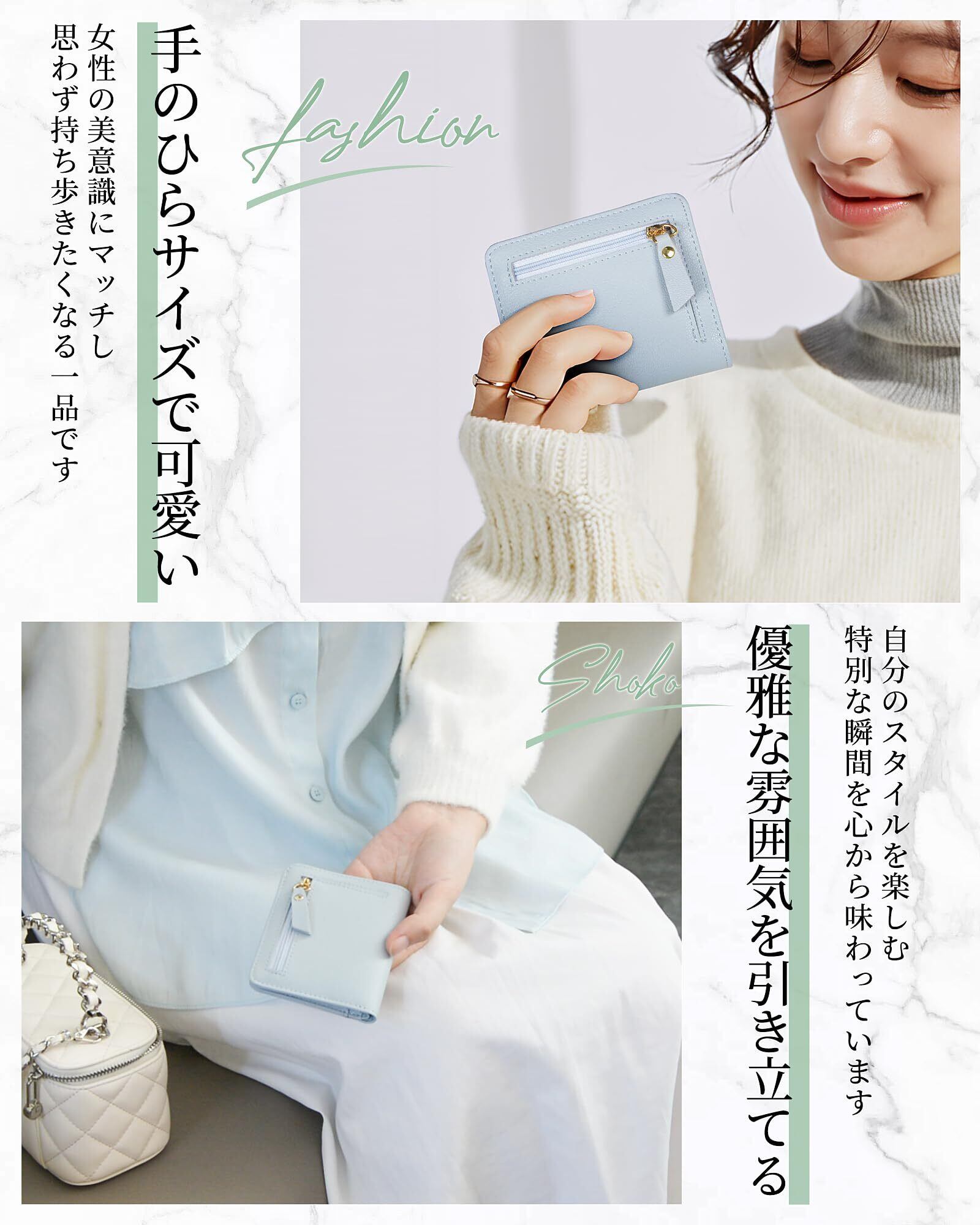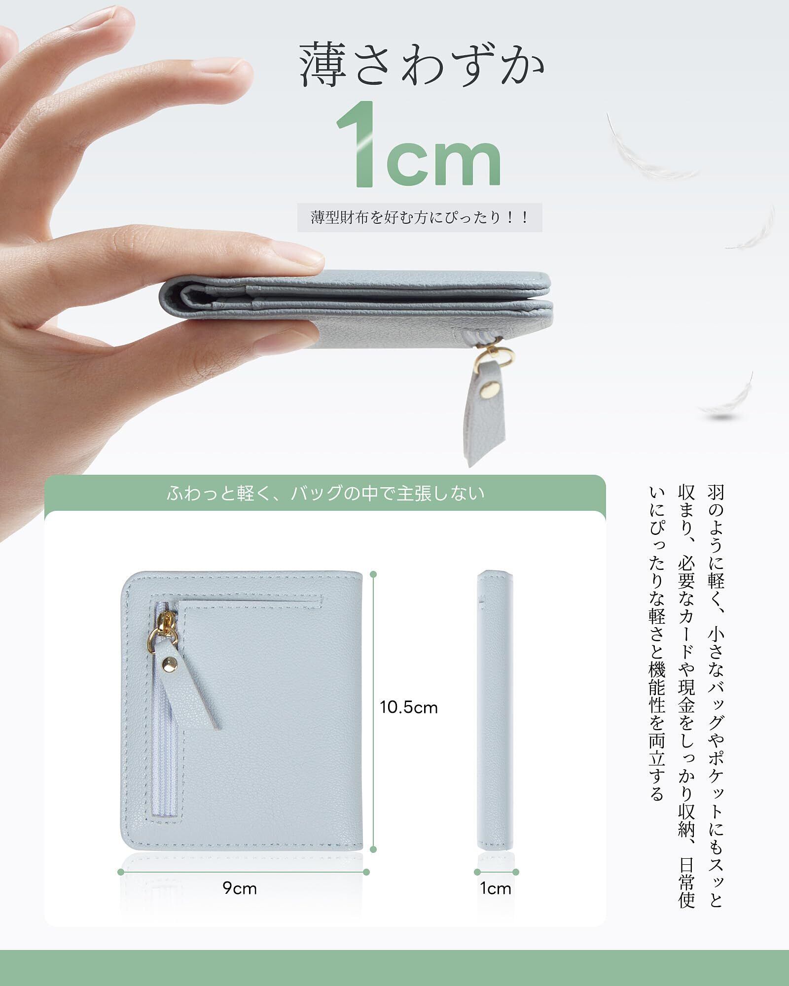 【薄い財布】従来のレディース財布の厚みを70%も減らして、厚さはなんと1cmになりました。このミニ財布が手のひらに収まる可愛いらしいサイズ感(10.5*9cm)で、カバンはもちろんのこと、ポーチやポケットに入れてもかさばらない2つ折り財布です。