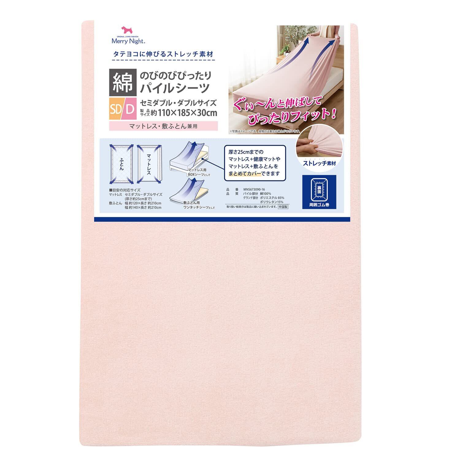 メリーナイト(Merry Night) シーツ のびのびぴったり パイルシーツ ピンク セミダブル~ダブル共通サイズ マットレス・敷ふとん兼用タイプ ストレッチ素材 シワなくピッタリフィット ふんわりやさしい肌触り洗える MNS673090-16